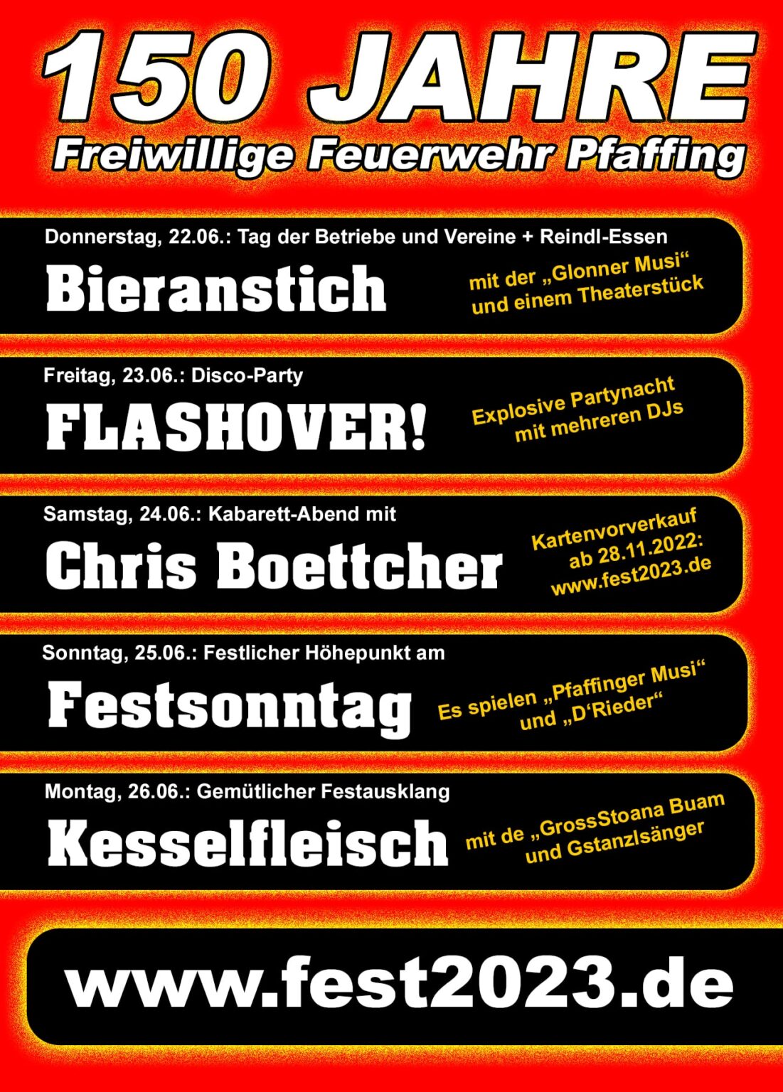 Das Kesselfleischessen am Montag-Abend bildet den Festausklang. Für Unterhaltung sorgen die „GrossStoana Buam“ und der Gstanzlsänger „Bäff“ aus der Oberpfalz.