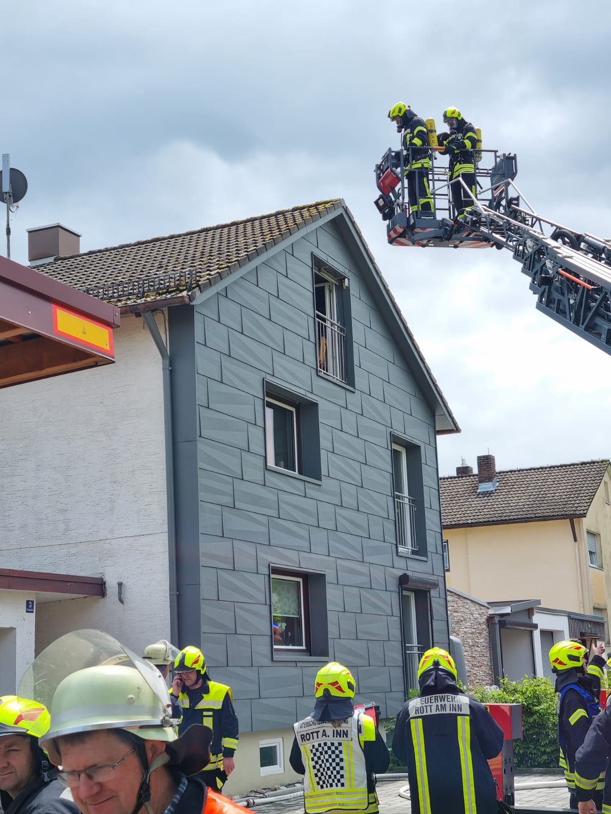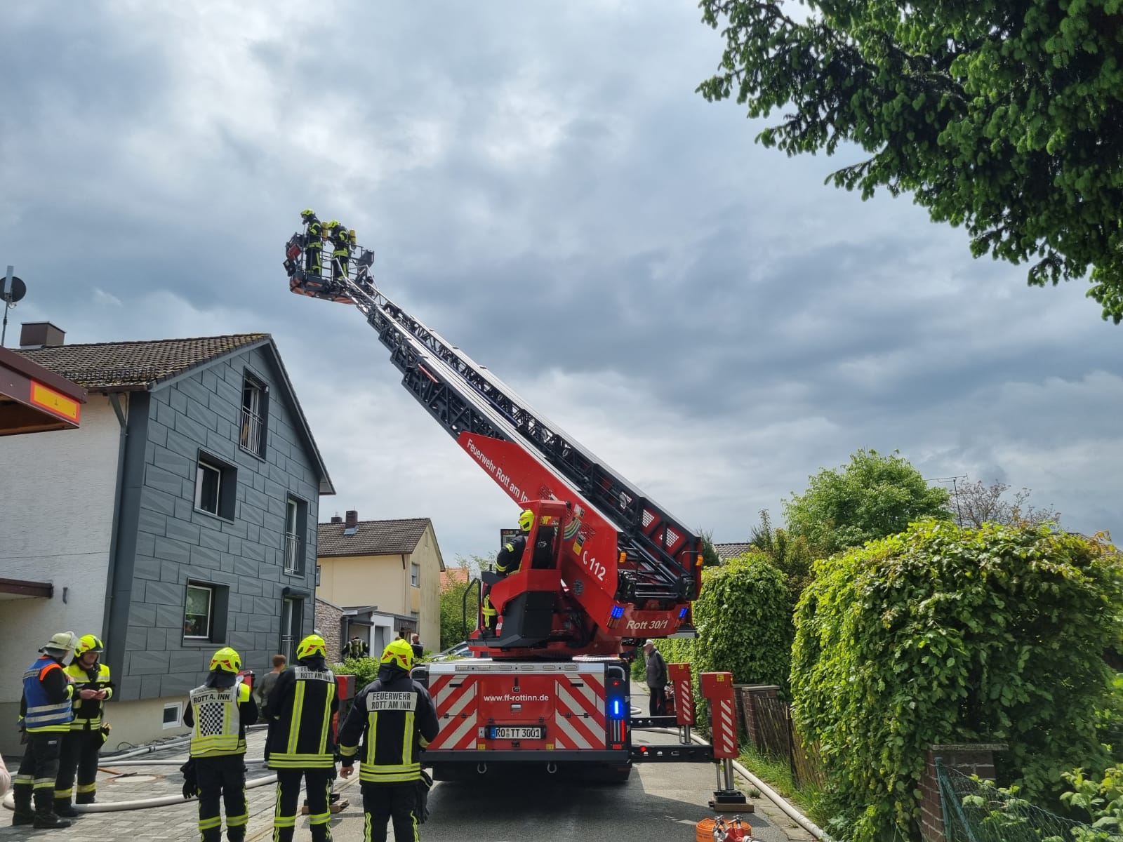 Mittwochmittag, 12.30 Uhr: Alarm für die Feuerwehren Rott und Griesstätt. Aus dem Fenster eines Wohngebäudes in der Edelweißstraße in Rott dringt schwarzer Rauch. Die Drehleiter der Feuerwehr Rott ist im Einsatz. Fotos: RM