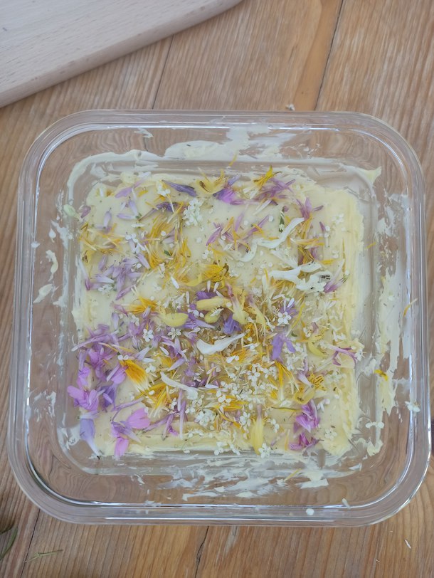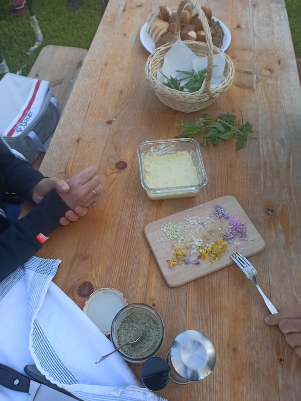 Im Anschluss zeigte die Kräterpädagogin wie man mit nur drei Zutaten in kürzester Zeit selbst einen pflegenden Lippenbalsam herstellen kann. Die gesammelten Blüten verarbeiteten die Teilnehmerinnen zu einer leckeren Blütenbutter. Mit einer großen Auswahl an selbstgebackenem frischem Brot ließ man sich die Blütenbutter schmecken. Gemeinsam ließen die Landfrauen den Abend noch gemütlich in der schönen und ruhigen Gegend am Atteldamm ausklingen.