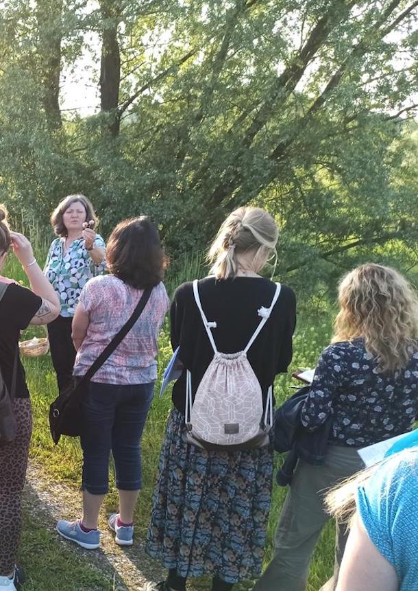 Da dieses Mal die Blüten im Vordergrund standen, sammelten die Teilnehmerinnen gute Bekannte, wie den Löwenzahn, den Rotklee, das Gänseblümchen oder den Holunder, aber auch besondere Pflanzen wie den „Stinkenden Storchenschnabel“, die Wiesen-Witwenblume oder die Lichtnelke. Auch fand man ein eher seltenes Exemplar – eine weiße Taubnessel. Monika Voggenauer ging auch auf die Eigenschaften und die Verwendung anderer Wildkräuter, wie den Giersch, der Brennnessel oder den Spitzwegerich ein. Außerdem ging sie auf die optischen Details des Gierschs ein, um die mögliche Verwechslungsgefahr mit dem giftigen Kälberkropf, der ebenfalls auf unserer Route zu finden war, aufzuzeigen.