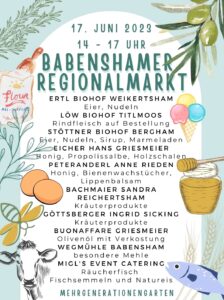 Eine Besonderheit ist dieses Mal der erste Babenshamer Regionalmarkt mit Betrieben aus Babensham in der historischen Kegelbahn. Es gibt auch eine Schnitzeljagd für Kinder und es können Wachsreste, Althandys, Kronkorken und Briefmarken abgegeben werden, was alles einem guten Zweck zugeführt wird.