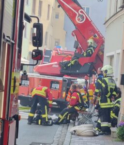 Eine Feuerwehrfrau überlegt kurz und wird wehmütig. Ihr fehle im Moment sehr ihr Opa. Er habe vor vielen Jahrzehnten in der Altstadt einen Brand mitgelöscht und hätte vielleicht einen Hinweis geben können, wie noch effektiver hier geholfen werden hätte können. „Das ist nämlich eine echte Herausforderung hier mit den Häuserzeilen in der Altstadt“, weiß die Kameradin.