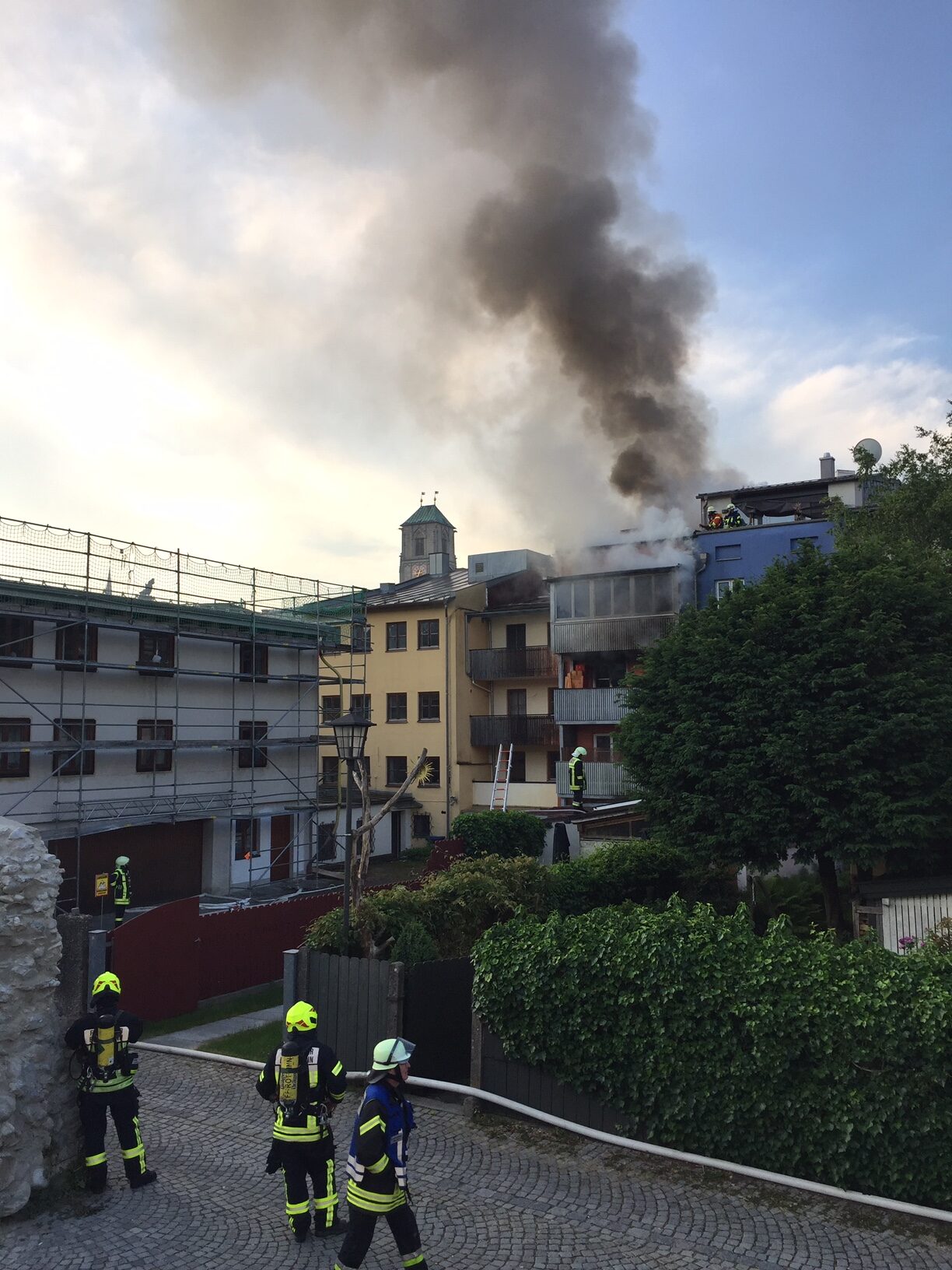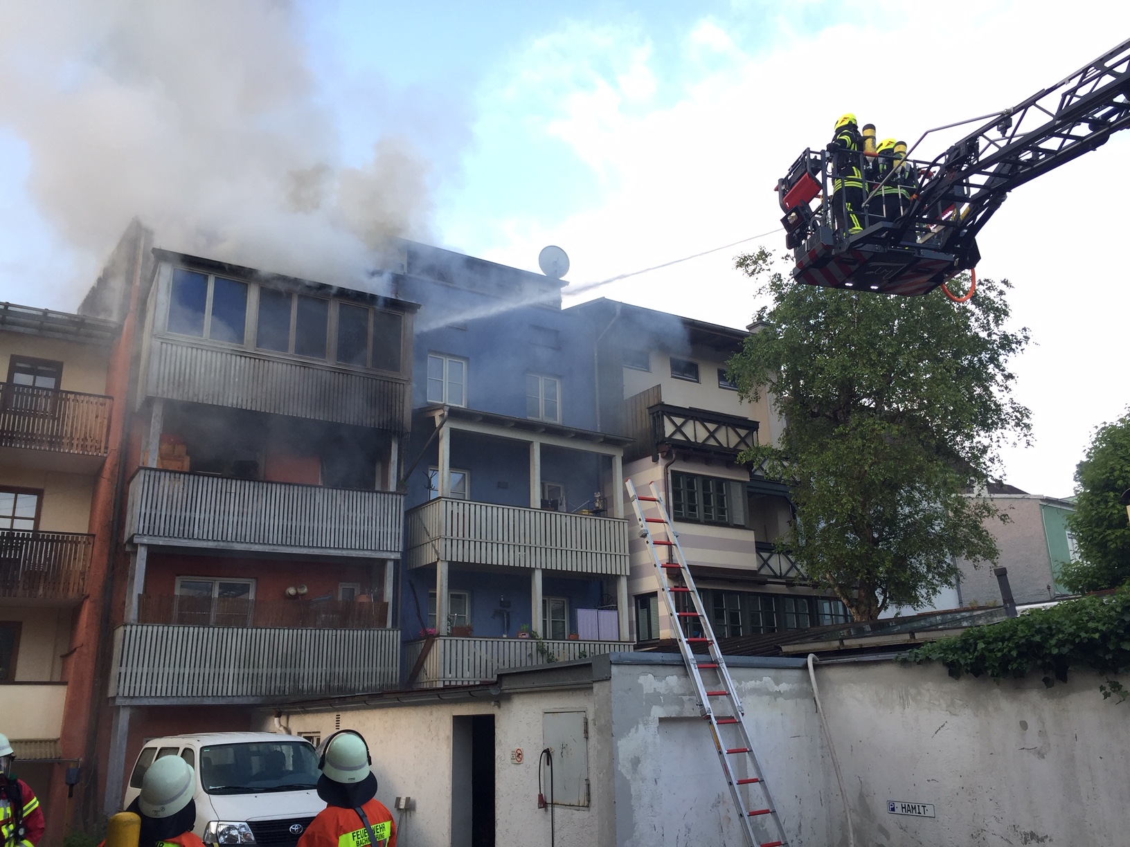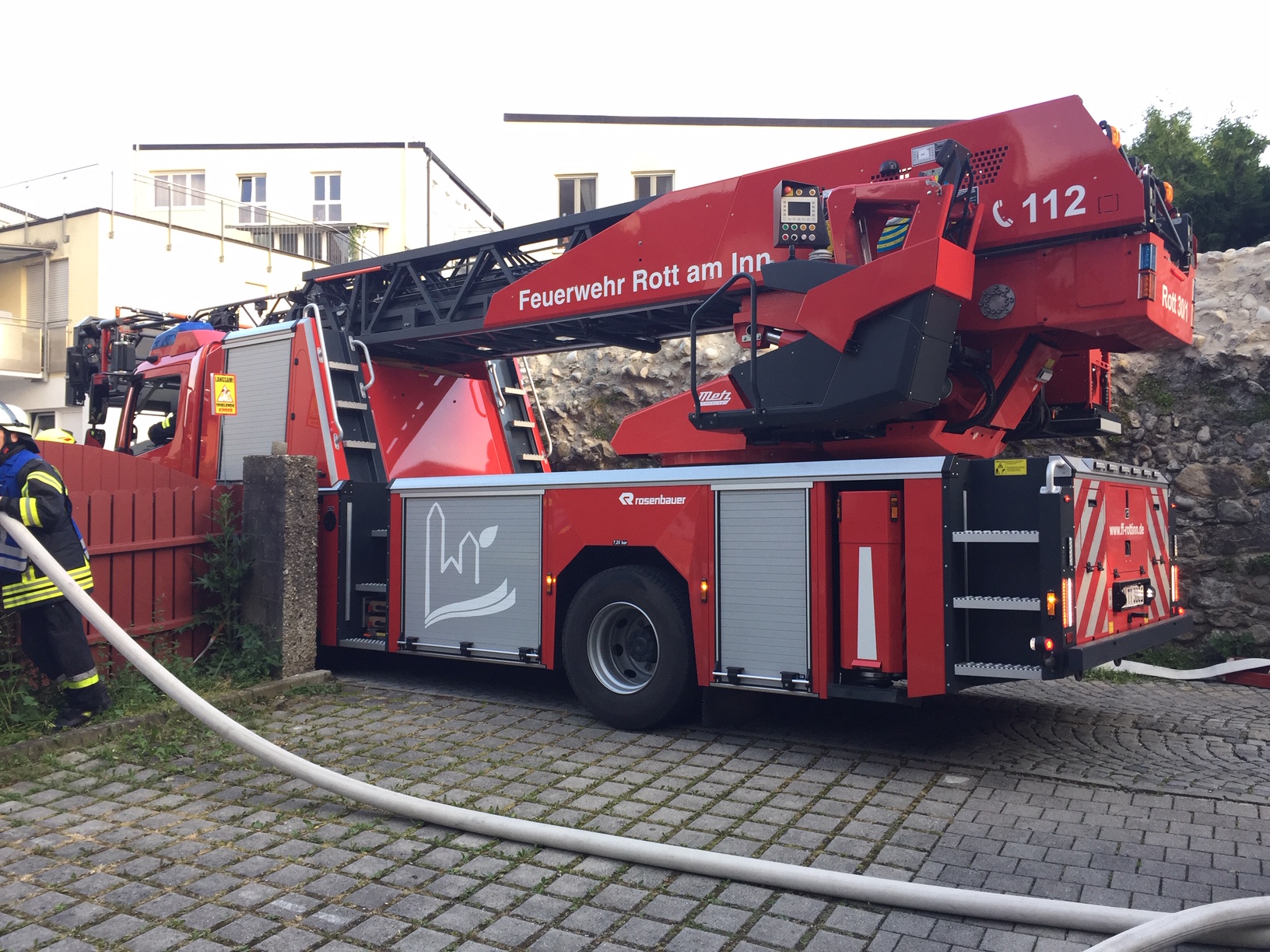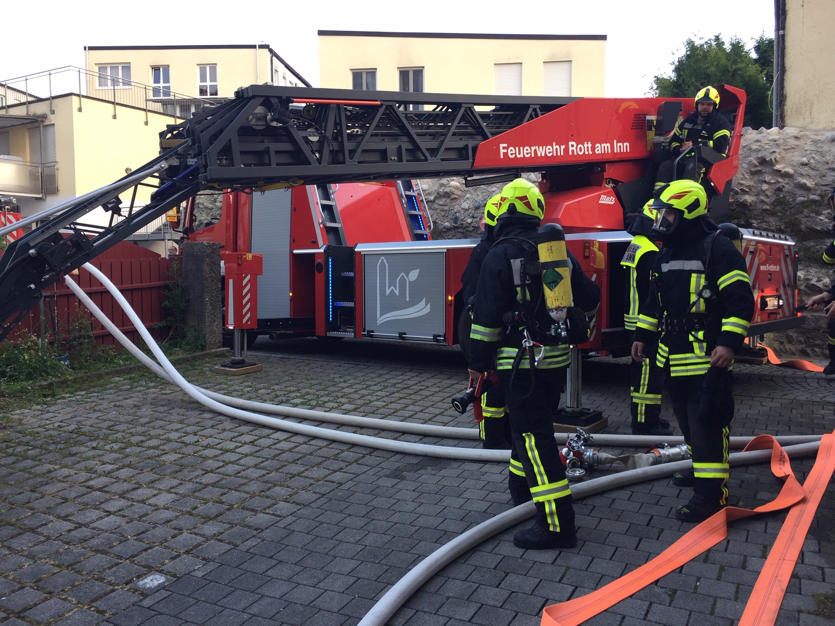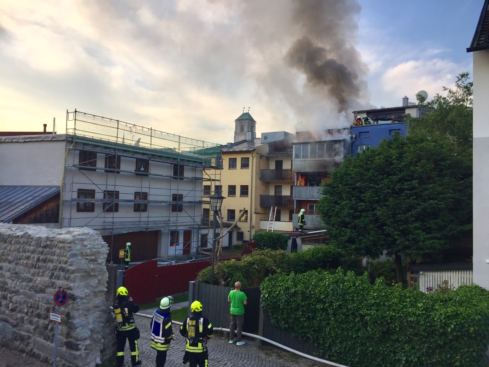 UPDATE 2: Mittlerweile (7.05 Uhr) sind offenbar vier Wohneinheiten von dem Brand betroffen. Immer wieder steigt dicker Rauch auf. Die Drehleiter der Feuerwehr Rott fährt über die schmale Gasse an der Stadtmauer an. Der Brand wird von zwei Seiten bekämpft. Auch Polizei und Rettungsdienst sind im Einsatz.