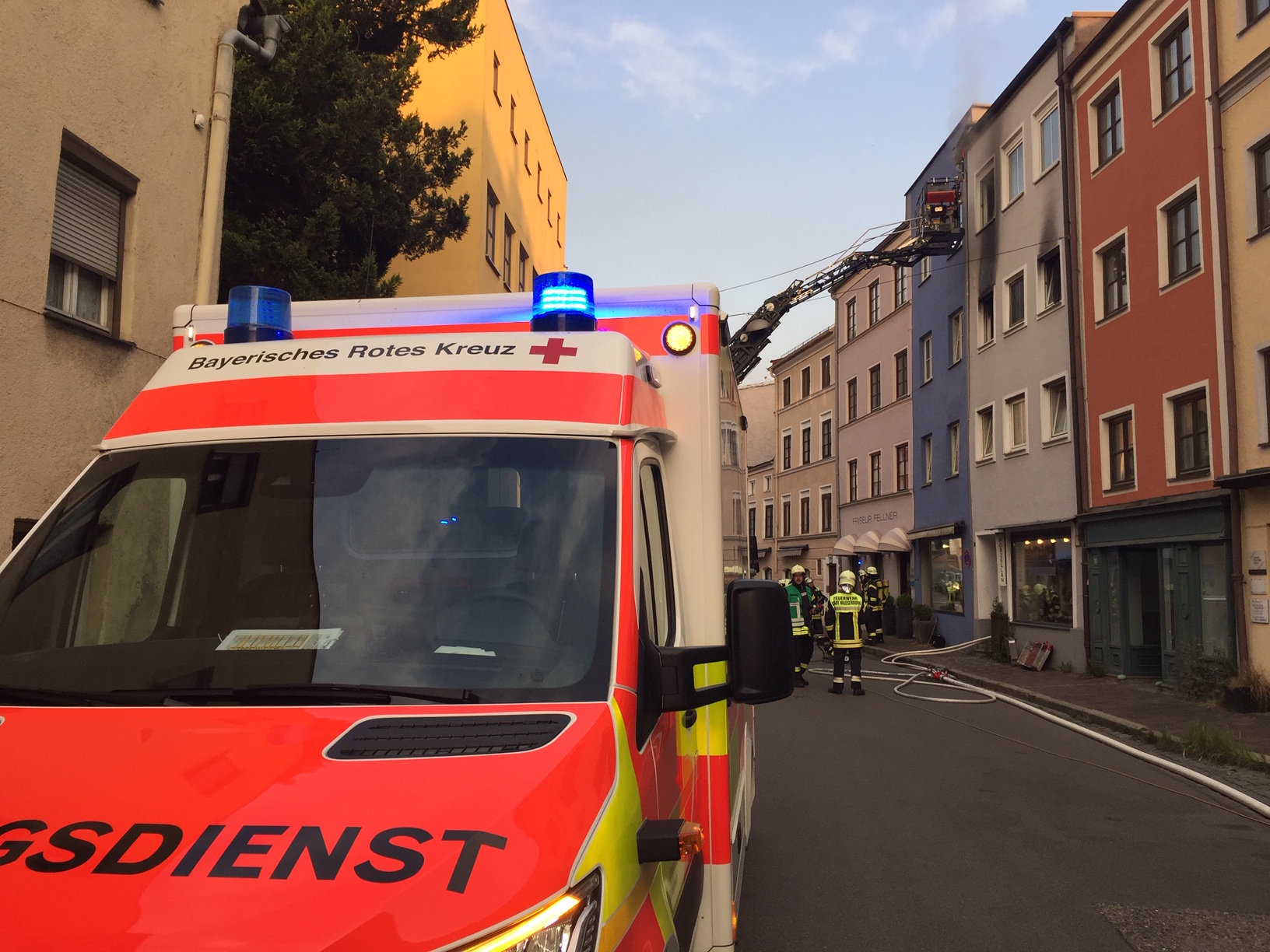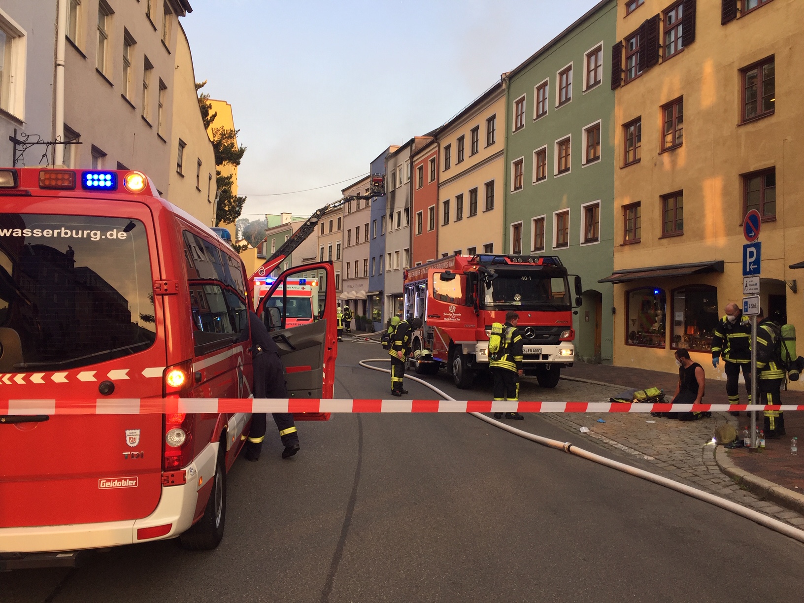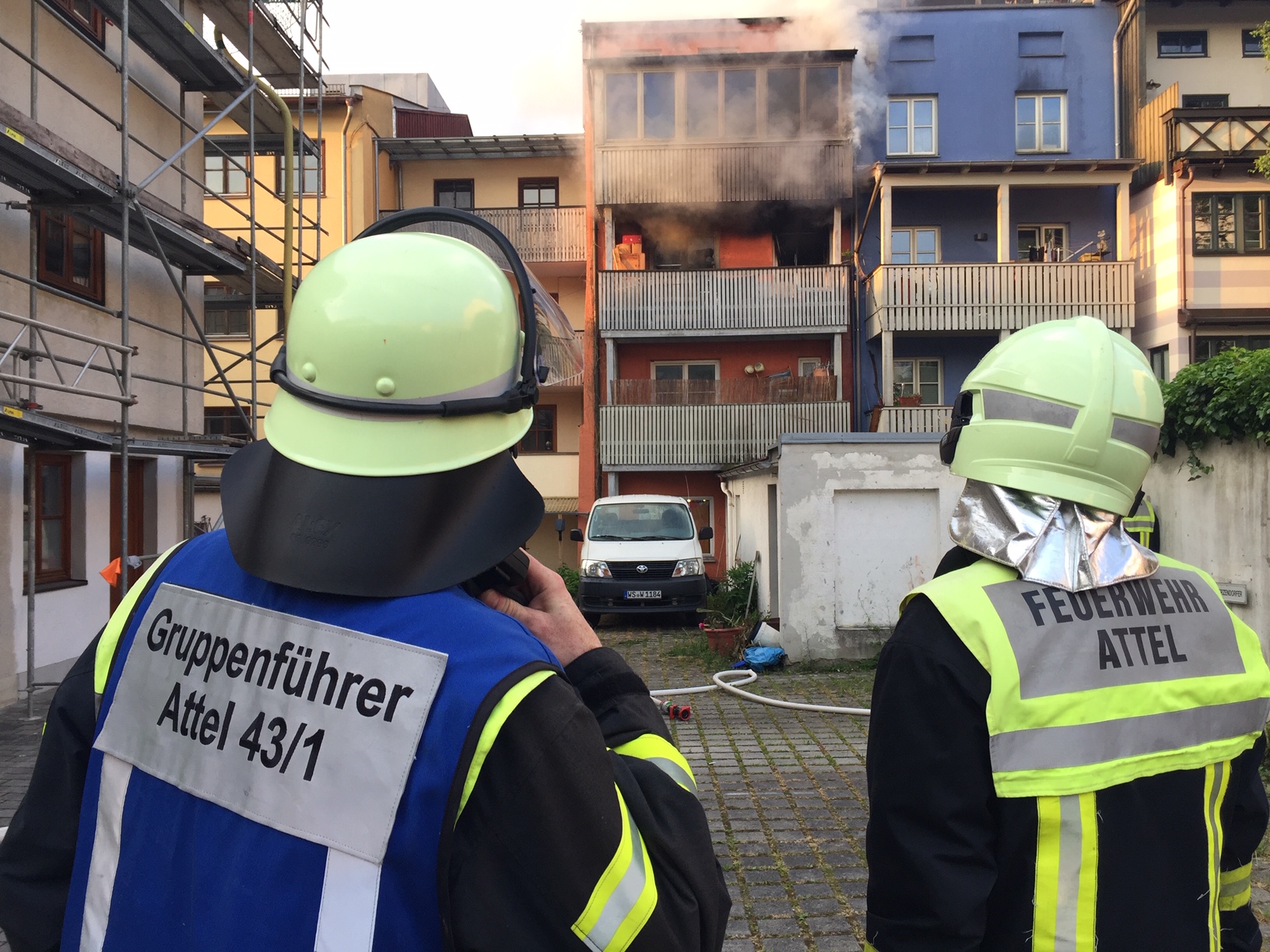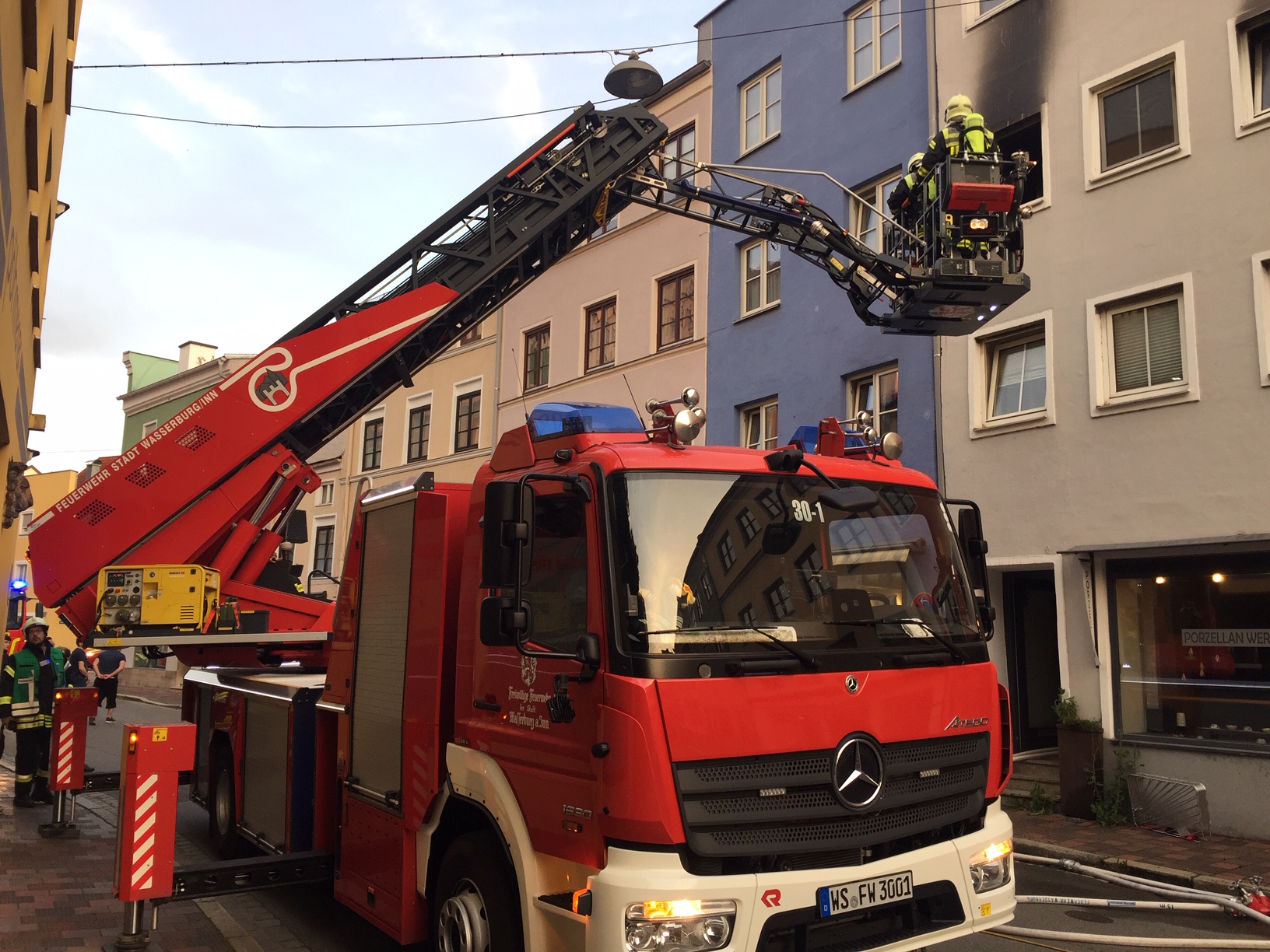 Innerhalb kürzester Zeit – auch bedingt durch die Nähe zum Wasserburger Feuerwehrgerätehaus – war das erste Löschfahrzeug besetzt mit einer Löschgruppe am Einsatzort. Dort drang bereits dichter Rauch aus den Fenstern im zweiten Obergeschoss. Glücklicherweise konnten alle Bewohner das Gebäude noch vor Eintreffen der ersten Einsatzkräfte selbstständig verlassen. Mit zwei Trupps unter Atemschutz wurde sofort ein Innenangriff mit zwei C-Rohren vorgenommen. Trotz extremer Hitze konnte die in Vollbrand stehende Wohnung rasch gelöscht werden.