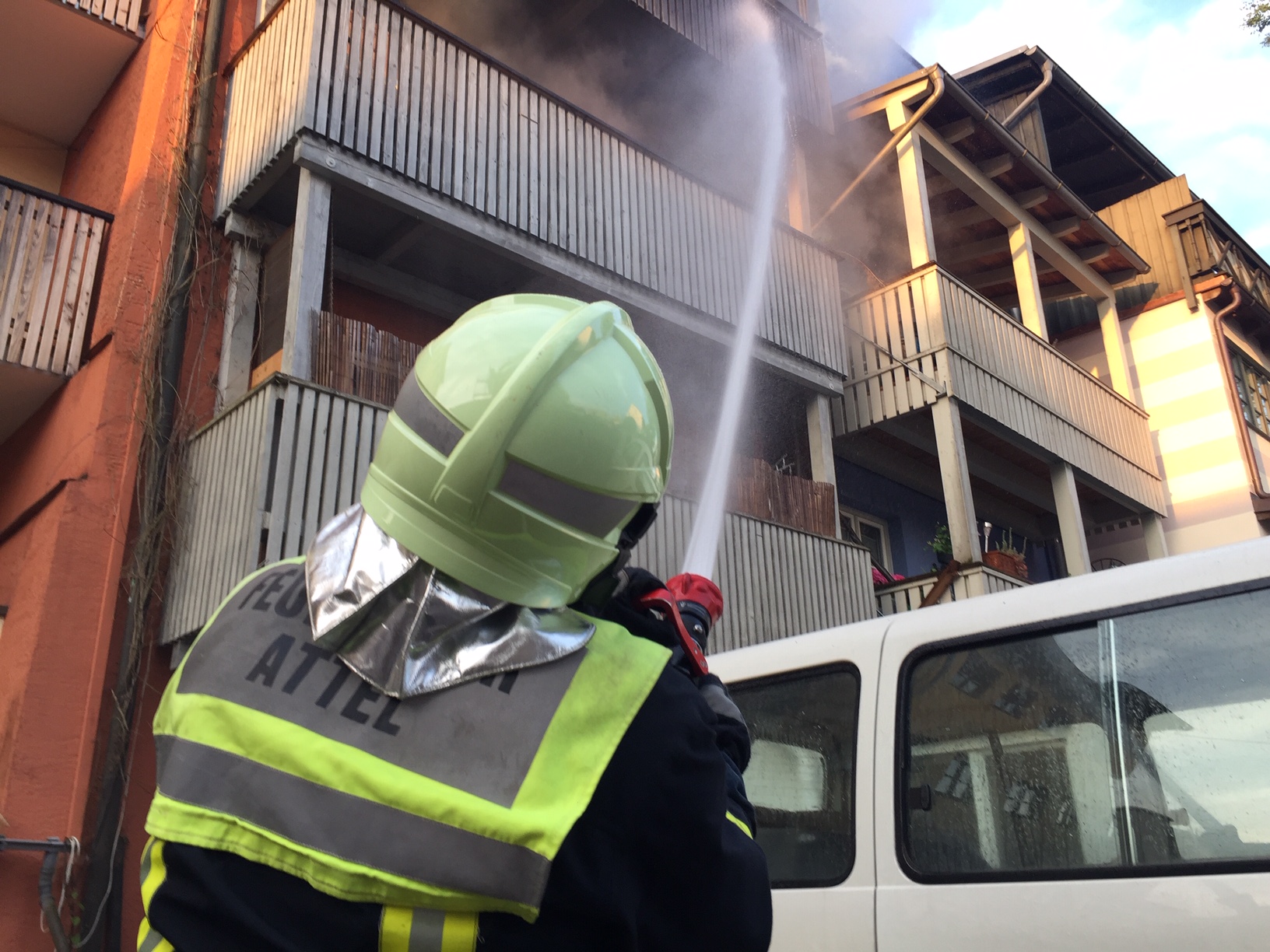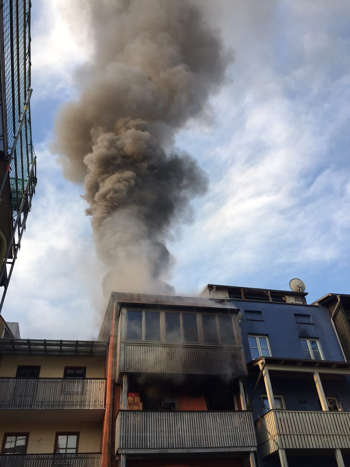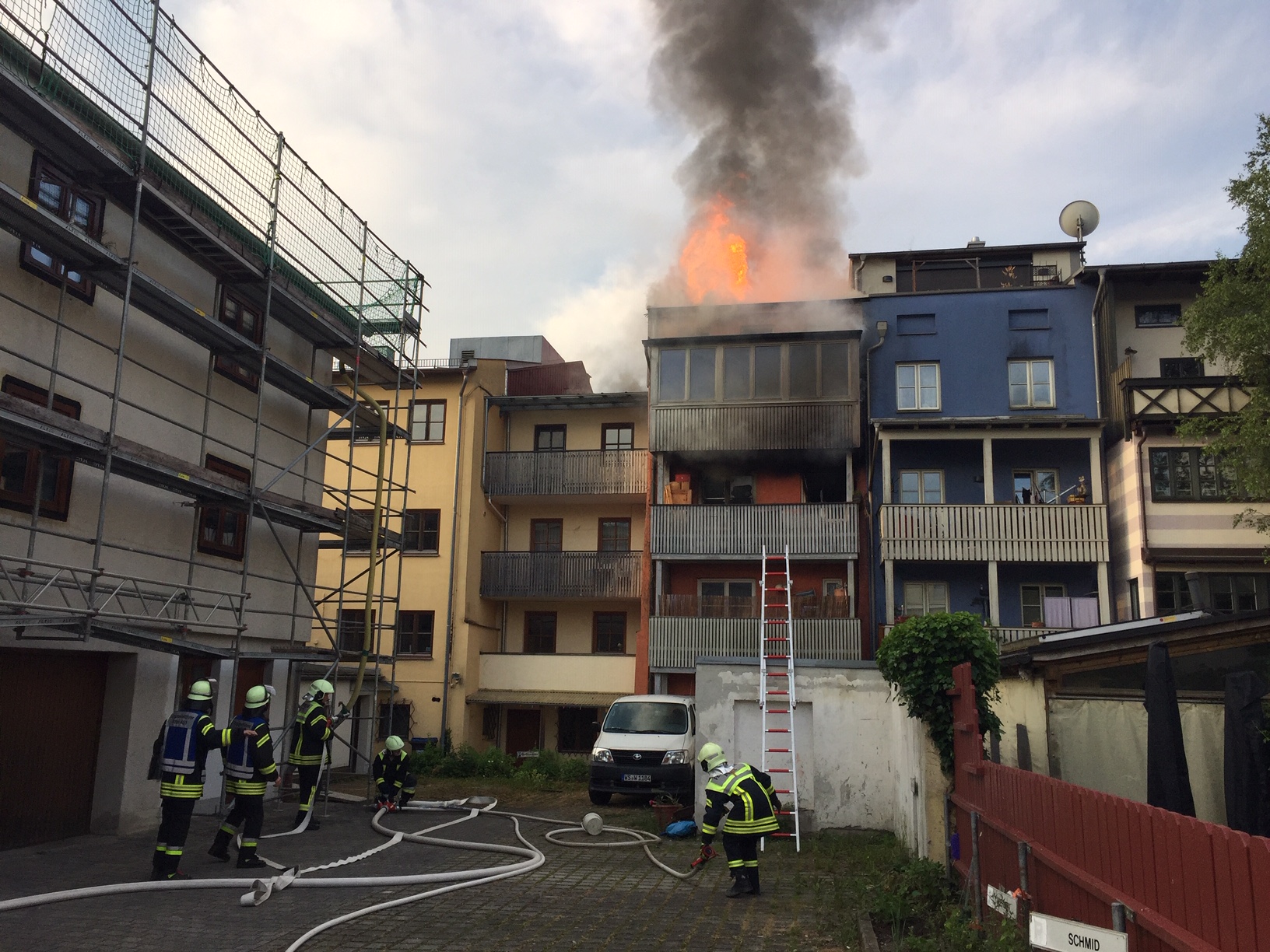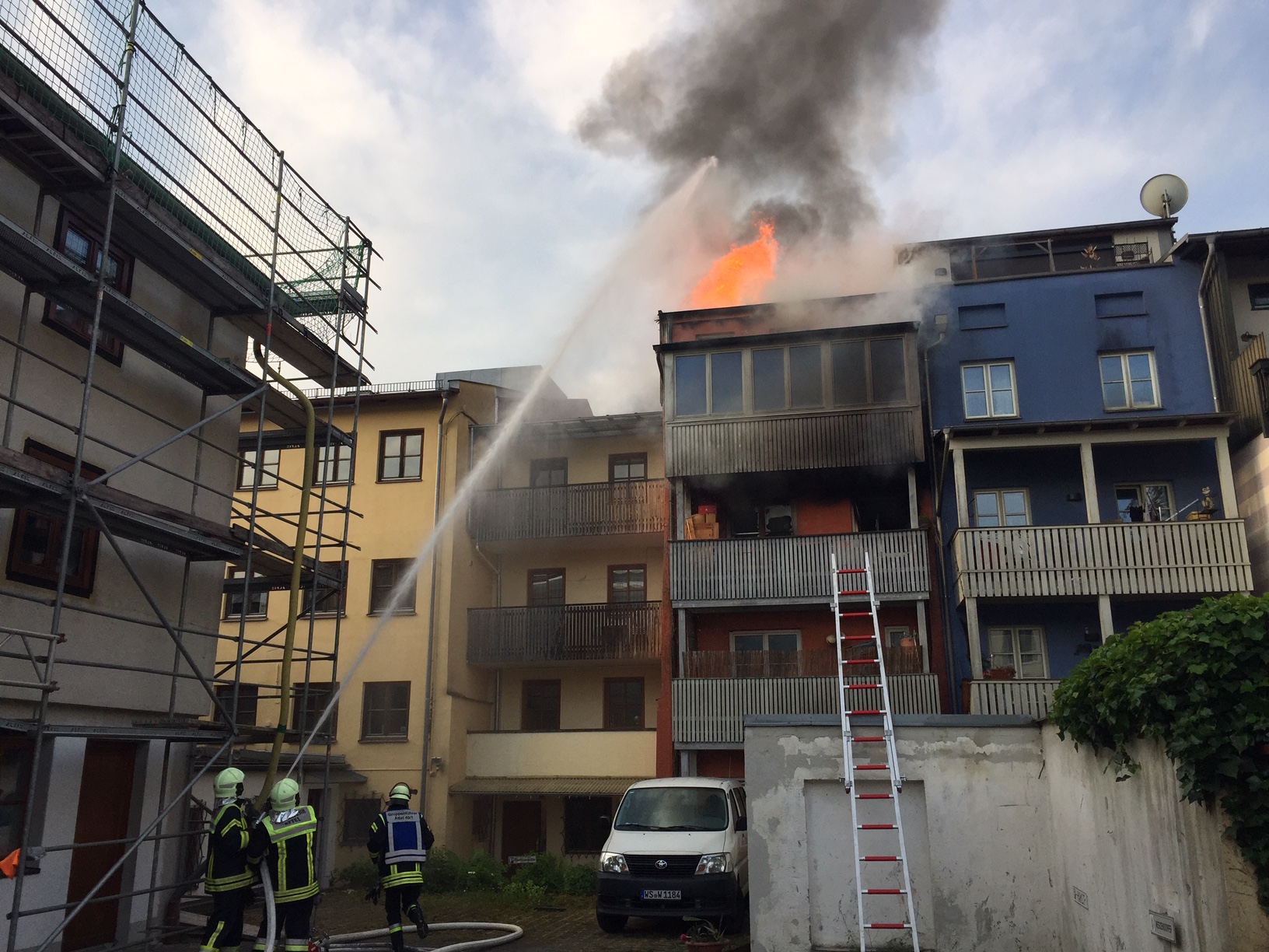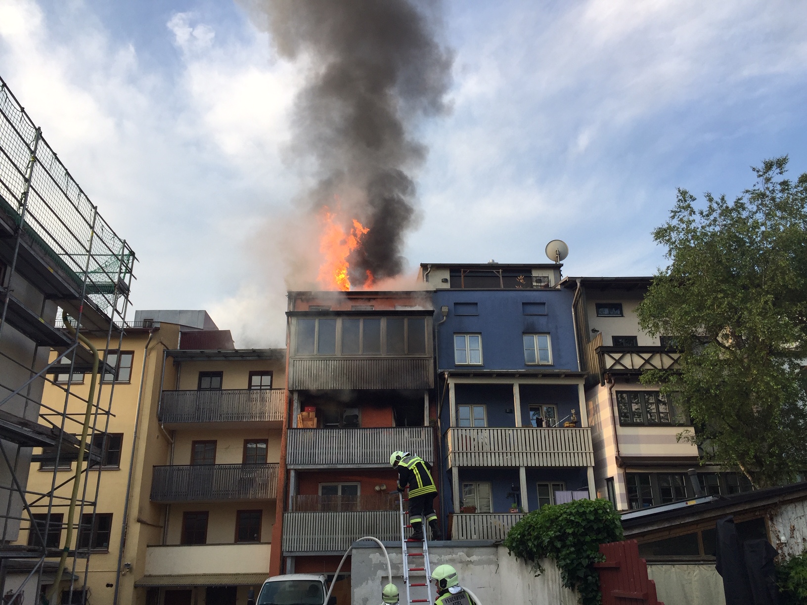 Innerhalb kürzester Zeit – auch bedingt durch die Nähe zum Wasserburger Feuerwehrgerätehaus – war das erste Löschfahrzeug besetzt mit einer Löschgruppe am Einsatzort. Dort drang bereits dichter Rauch aus den Fenstern im zweiten Obergeschoss. Glücklicherweise konnten alle Bewohner das Gebäude noch vor Eintreffen der ersten Einsatzkräfte selbstständig verlassen. Mit zwei Trupps unter Atemschutz wurde sofort ein Innenangriff mit zwei C-Rohren vorgenommen. Trotz extremer Hitze konnte die in Vollbrand stehende Wohnung rasch gelöscht werden.