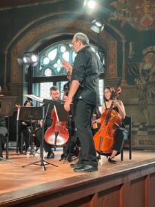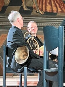 Zum Schluss entbot das Ensemble noch Joseph Haydns Sinfonie in e-moll Nr. 44, die sich streng an den Aufbau der klassischen Sinfonie hielt, wovon der letzte Satz, ein Rondo in fulminantem Tempo, durchaus Zeugnis abzulegen vermochte. Joachim Tschiedel sprach von einer „Klangigkeit wie zu Mozarts Zeiten“. Damit nahm er Bezug auf die Instrumente des Ensembles, aber auch auf das Wasserburger Publikum, das der Bassist des Orchesters, Florian Schormair, in einem Gespräch am Rande des Abends, als außerordentlich kunstsinnig und empfänglich für die Musik der Accademia umschrieb.
