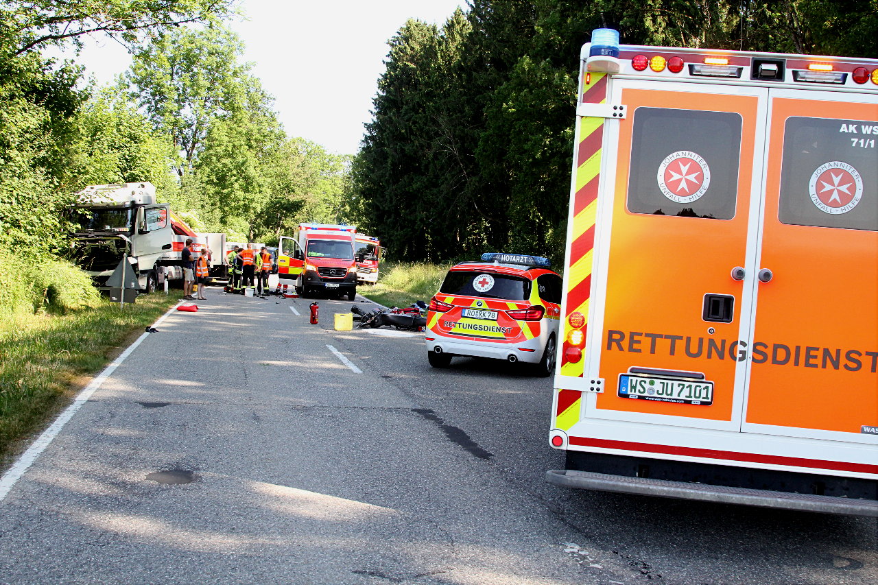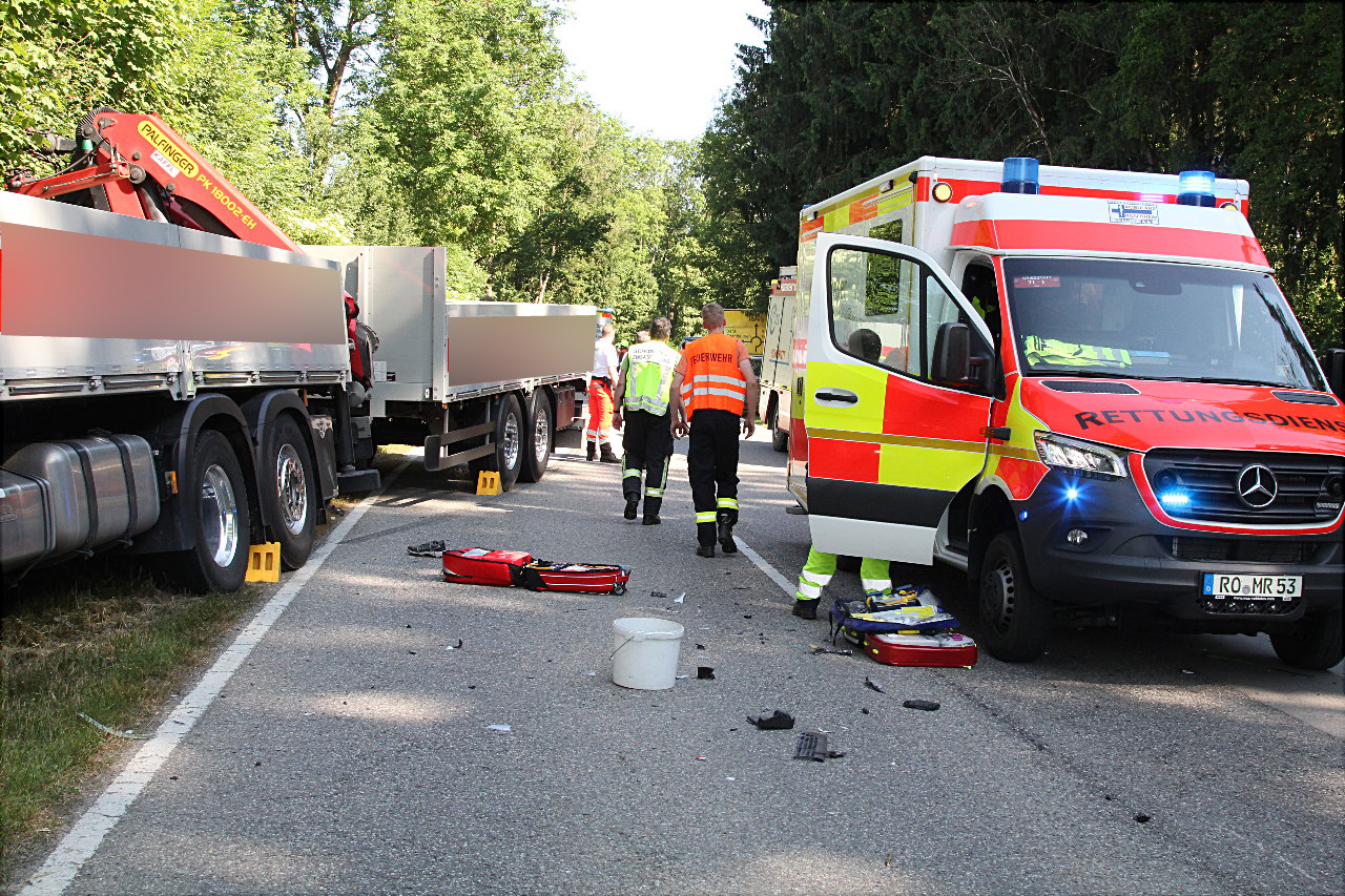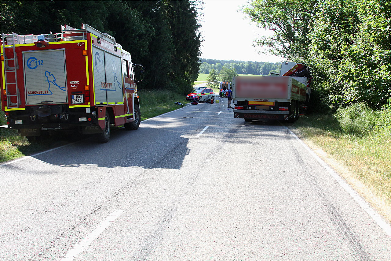 Schwerer Unfall am Montagnachmittag auf der Staatsstraße 2092 bei Schonstett: Beim Weiler Frieberting ist ein Motorrad mit einem Lkw kollidiert. Der Motorradfahrer wurde so schwer verletzt, dass er mit einem Rettungshubschraubern in eine Klinik geflogen werden musste. Polizeibericht folgt …