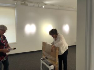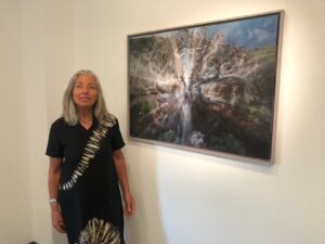 Dann erzählt sie nicht ohne Stolz von einem Bild, das die Stadt Wasserburg auf Initiative von Bürgermeister Kölbl von ihr erworben und ihr jetzt als Leihgabe zur Verfügung gestellt habe. Dieses Werk kann dann wieder in der Eingangshalle des Rathauses bewundert werden. Wir durften sie neben dem Werk fotografieren (Titelbild).