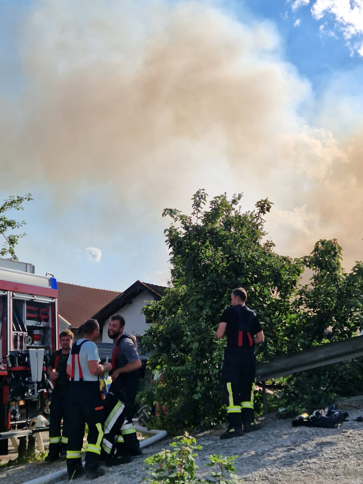 Die Flammen haben auf das Wohnhaus übergegriffen, die vielen Einsatzkräfte sind auch in den späten Abendstunden noch dabei, alles unter Kontrolle zu halten. Besondere Herausforderung dabei auch der Heustadel.