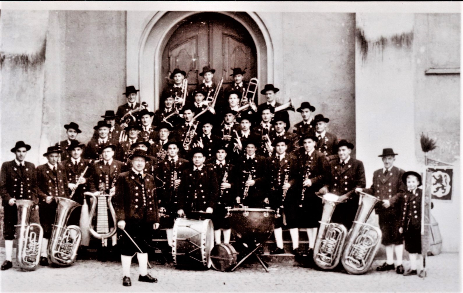 Dieses Foto ist – wahrscheinlich – die erste Aufnahme der Stadtkapelle in der 1953 unter anderem vom damaligen Wasserburger Heimatpfleger Theodor Heck und seiner Frau mitgestalteten Tracht der Stadtkapelle. Aufgenommen auf der Seitentreppe der Frauenkirche, ungefähr dort wo heute die Veranstaltung stattfinden wird.