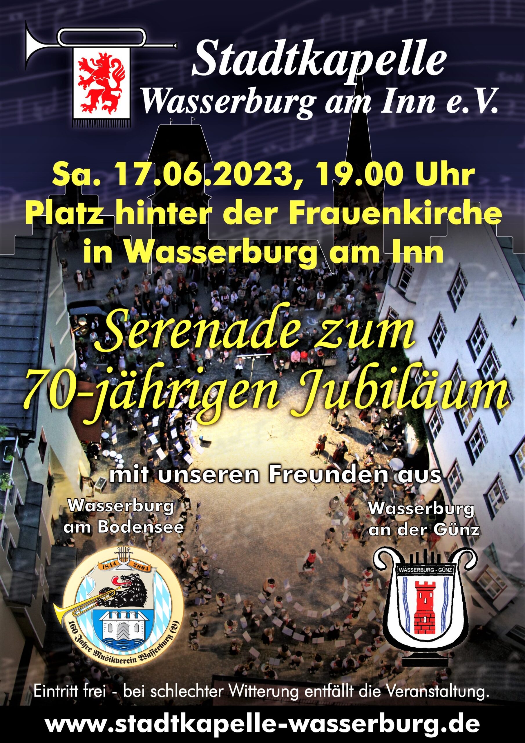 Zum kostenlosen Serenaden-Abend unter freiem Himmel lädt die Wasserburger Stadtkapelle am heutigen Abend herzlichst ein – anlässlich ihres 70. Geburtstages. Mit dabei werden die Musikfreunde aus Wasserburg an der Günz und aus Wasserburg am Bodensee sein.