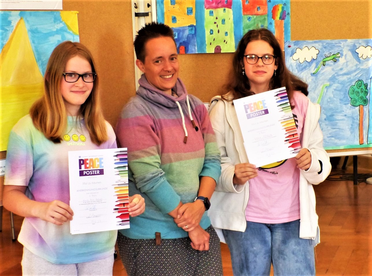 Foto unten von links die Zweitplatzierte Emily-Mia Herkner, die Kunstlehrerin Andrea Rieger und die Drittplatzierte Viktoria Olhäuser. Die Klassensiegerin Sarah Aicher war am Tag der Preisverleihung leider erkrankt …