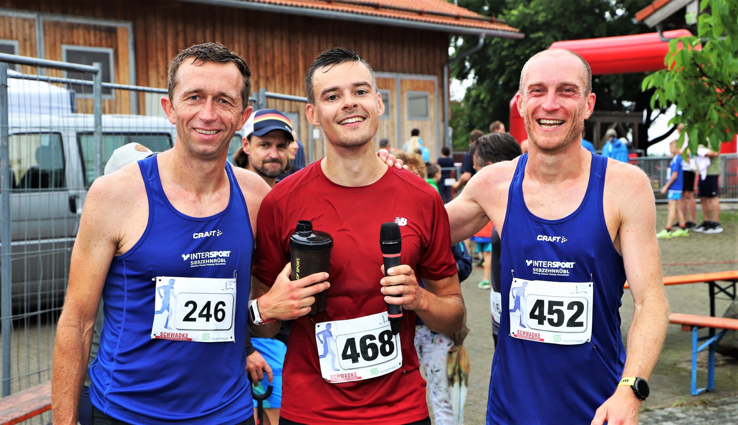 Foto unten: In der Königsdisziplin über zehn Kilometer konnte erneut Jakob Heindl vom TSV Wasserburg (34:56 Minuten) als Gesamtsieger vor Florian Spötzl (35:06, PTSV Rosenheim) und Christoph Merz (39:15, PTSV Rosenheim) triumphieren. Das Bild zeigt sie von links Christoph Merz (246), Jakob Heindl (468) und Florian Spötzl (452).