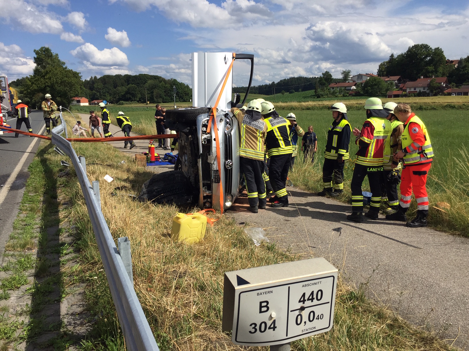 Am Dienstagnachmittag hat sich hat sich auf der B304 am Ortseingang von Steinhöring ein schwerer Unfall ereignet. Ein Pkw hat sich überschlagen. Die Insassen wurden verletzt. Rettungsdienst, Polizei und Feuerwehr waren im Einsatz. Die Bundesstraße musste während der Rettungsmaßnahmen komplett gesperrt werden. Polizeibericht folgt. Fotos: Georg Barth