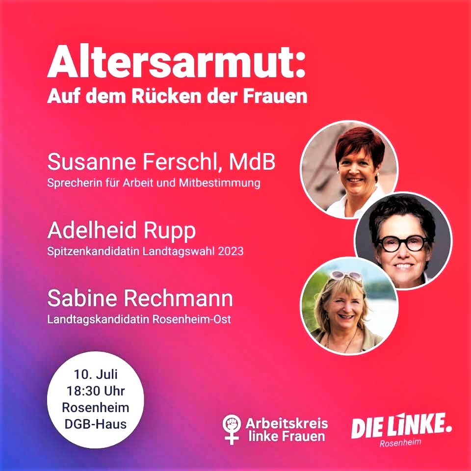 Der „Arbeitskreis linke Frauen“ in Rosenheim konnte für kommenden Montag, 10. Juli, Susanne Ferschl – Mitglied des Bundestages – mit einem Vortrag zum Thema „Doppelt ausgebeutet: Prekäre Beschäftigung und Armut sind weiblich“ gewinnen.