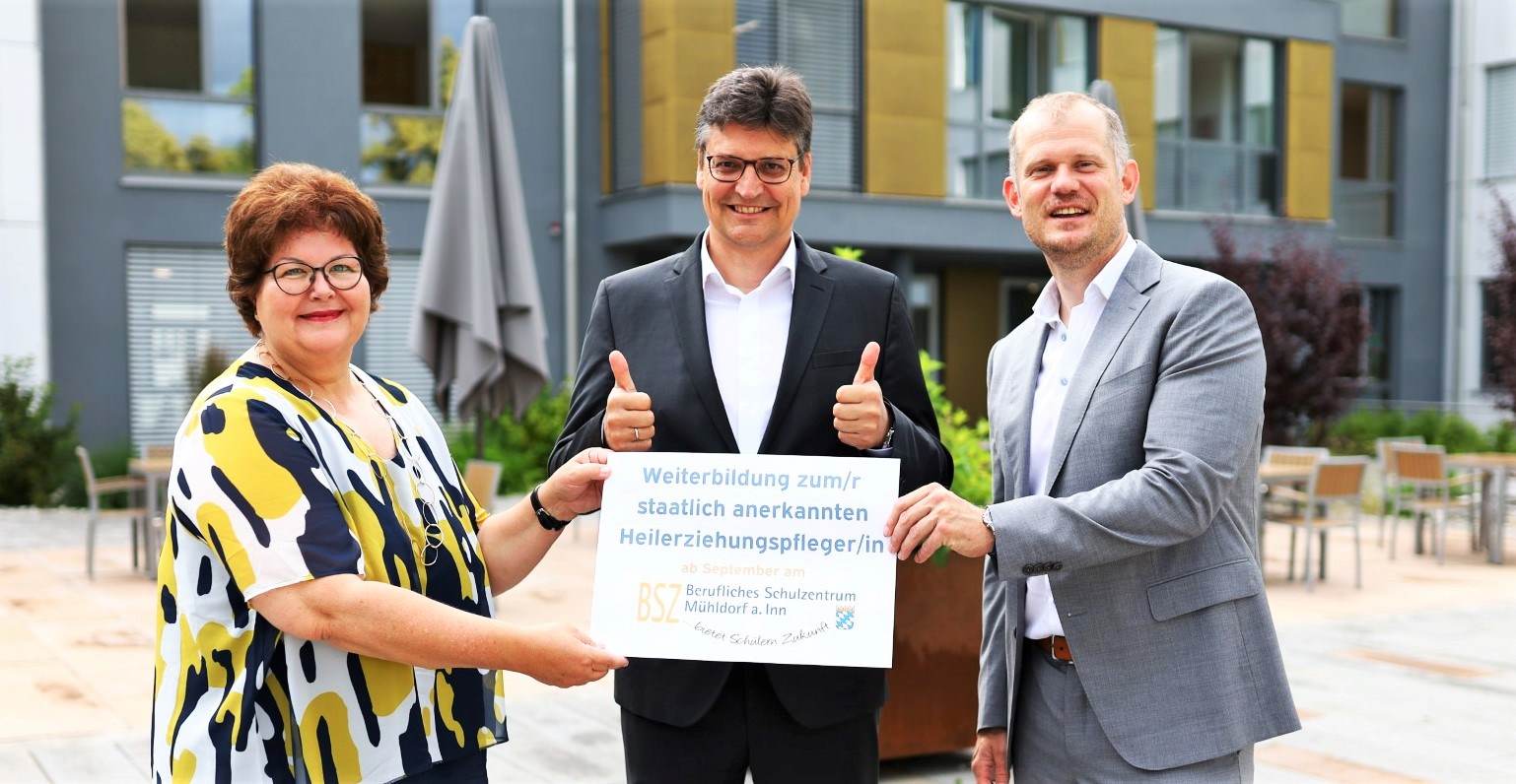 Zum Foto oben: Ab September startet am BSZ die Weiterbildung zum/r staatlich anerkannten HeilerziehungspflegerIn. Dafür gibt es von Schulleiterin Cornelia Taube, Landrat Max Heimerl und dem stellvertretenden Schulleiter Raphael Bablick ein „Daumen hoch“.