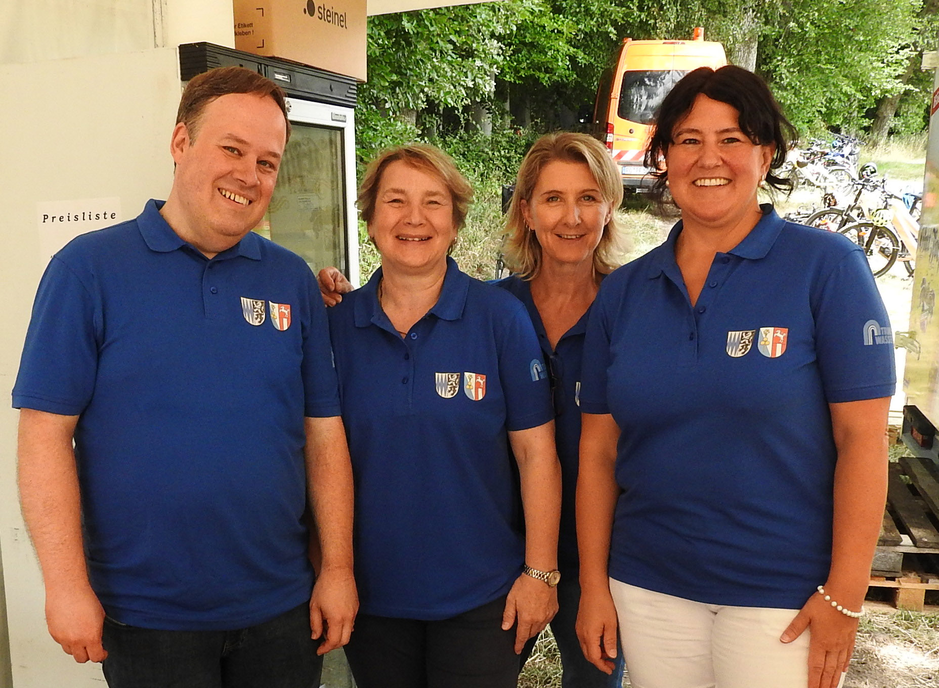 Foto unten: Alle halfen gerne zusammen – hier die Crew beim Getränke-Ausschank. Ob nun Wasser am meisten gefragt war oder doch a kühle Hoibe Bier, wissen wir nun nicht so genau ….