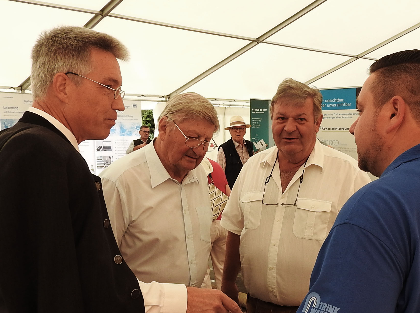 Im Info-Zelt herrschte stets großer Andrang am gestrigen Sonntag. Hier informieren sich von links Landrat Lederer und Pfaffings Altbürgermeister Josef Niedermeier sen. im Beisein von Albachings Gemeindeoberhaupt Rudolf Schreyer bei Franz Kilger, der als 2. Wasserwart der Gemeinde Pfaffing kompetent berichten konnte.