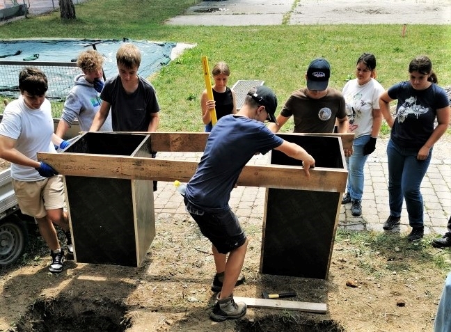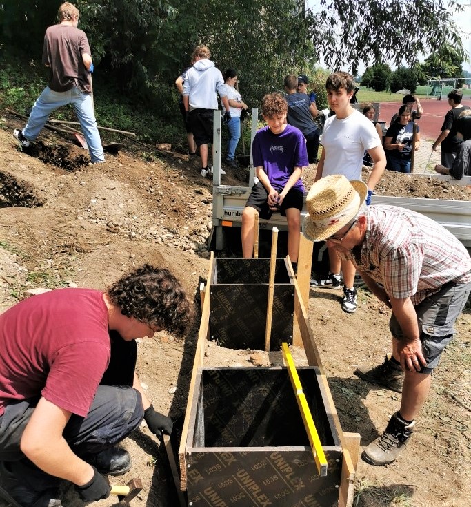 In Kooperation mit der ortsansässigen Baufirma Besan begann am Montag der Bau von sechs Würfeln aus Beton, die die Grundlage für die Sitzgelegenheiten im zukünftigen Klassenzimmer im Freien bilden.