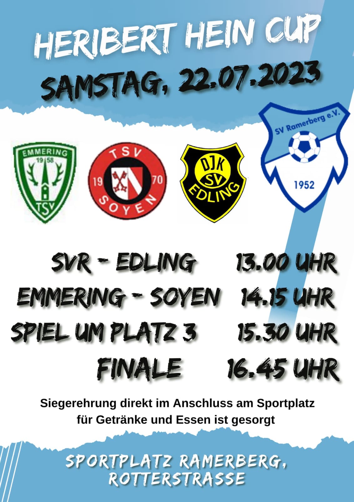 Am kommenden Samstag findet beim SV Ramerberg – zu Ehren des verstorbenen Ehrenvorstands – der Heribert-Hein-Cup auf dem Sportplatz in Ramerberg statt. Beginn ist um 13 Uhr mit vier Teams. Kreisklassist Ramerberg konnte im letzten Jahr den Wanderpokal gewinnen und möchte Selbigen natürlich gerne verteidigen – gegen Edling, Emmering und Soyen.
