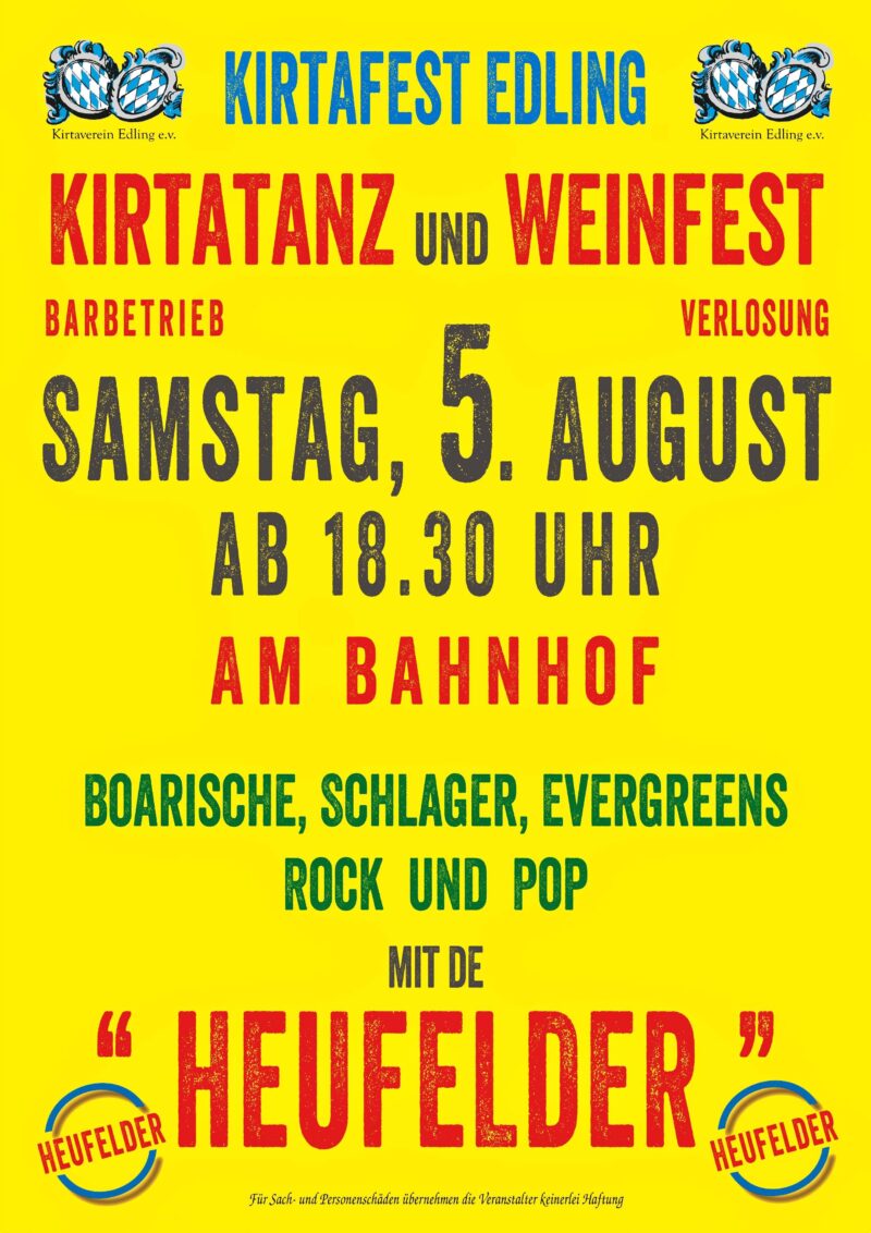 Boarisch, rockig, live: De „Heufelder“ werden unter freiem Himmel in Edling einheizen. Und zwar am Samstag, 5. August – und das wieder am Bahnhofs-Festplatz in Edling. Denn der Kirtaverein ist bekanntermaßen umgesiedelt (wir berichteten) und lädt ab 18.30 Uhr zu seinem beliebten Weinfest herzlichst ein. Zum Fröhlich-Sein mit eigenem Tanzboden …