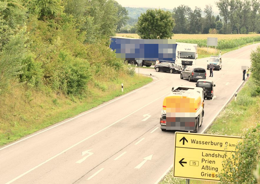 Zu Verkehrsbehinderungen kam es heute auf der Staatsstraße 2359 bei Griesstätt. An der Kreuzung zur Umgehungsstraße waren ein Lkw und ein Pkw zusammengeprallt. Die Polizei war im Einsatz. Zum Glück gab es keine Verletzten. Foto: WS