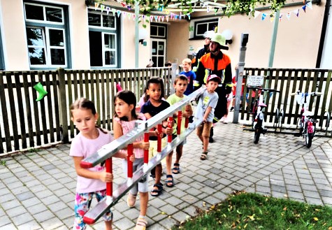 Die etwa 40 Kinder und einige Kindergärtnerinnen staunten nicht schlecht, als dann plötzlich drei Feuerwehrautos mit Blaulicht und Martinshorn zum Kindergarten eilten.