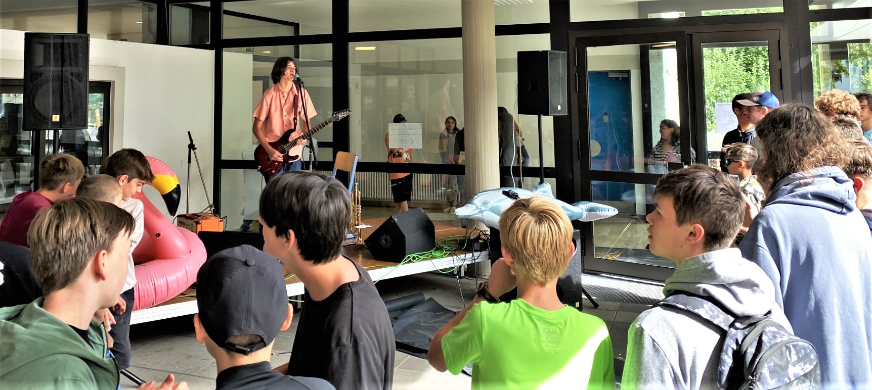 Für Klasse-Unterhaltung sorgte außerdem „VIZI“, ein Schüler aus der Klasse 9d (Foto), der mit hervorragendem Gesang, eigens komponierten Liedern, seiner Trompete, der Gitarre und einer Mundharmonika die Stimmung anheizte.