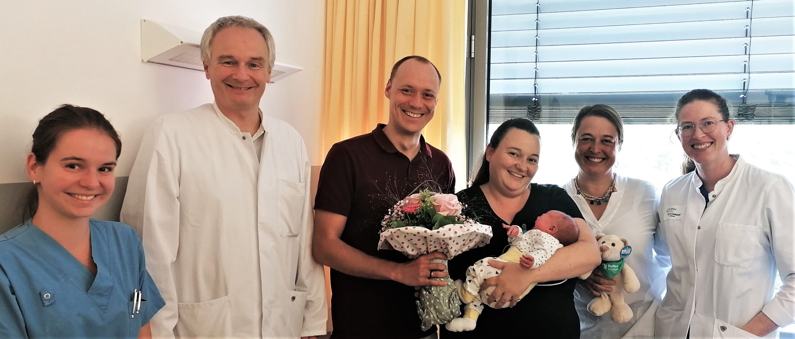 Als besonderes Geschenk überreichten die ersten Gratulanten – Chefarzt Dr. Andreas Schnelzer, Hebamme Barbara Vodermaier, Fachärztin Dr. Martina Colleselli sowie Assistenzärztin Dr. Tatjana Jans – einen Blumenstrauß und das RoMed-Teddybärchen, das als treuer Begleiter der Hanna zur Seite stehen soll.