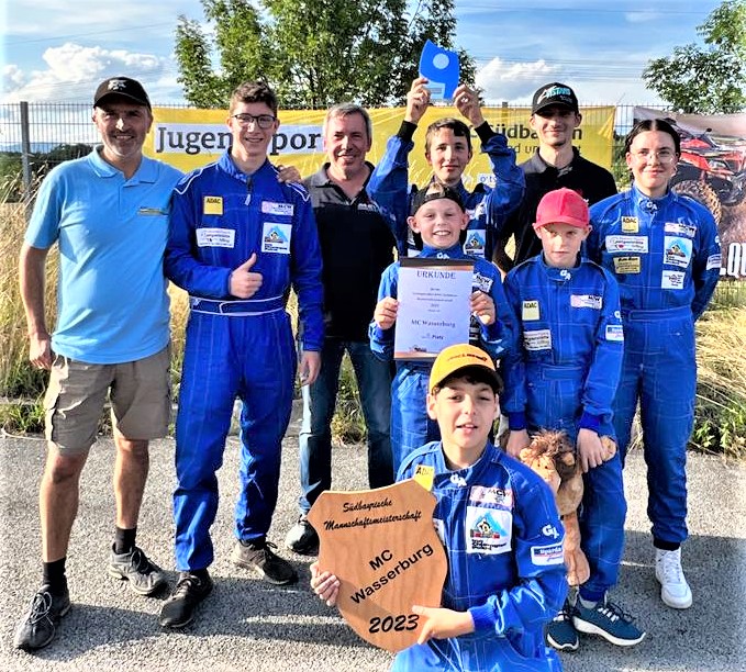 Das Team Wasserburg der Karts mit Verbrennungsmotor holte am Ende Platz acht von 23 Vereinen – von links Josef Maurus (Trainer), Matthias Maurus (K4), Klaus Traunsteiner (Trainer), Fabian Traunsteiner (K5), Moritz Giebel (K2), Noah Bieler (k1), Sebastian Gradl (Jugendleiter – hinten 2. von rechts), Nicolas Lorr (K3) und ganz rechts Sara Hundseder (K6), die in ihrer Klasse starke Vierte wurde.
