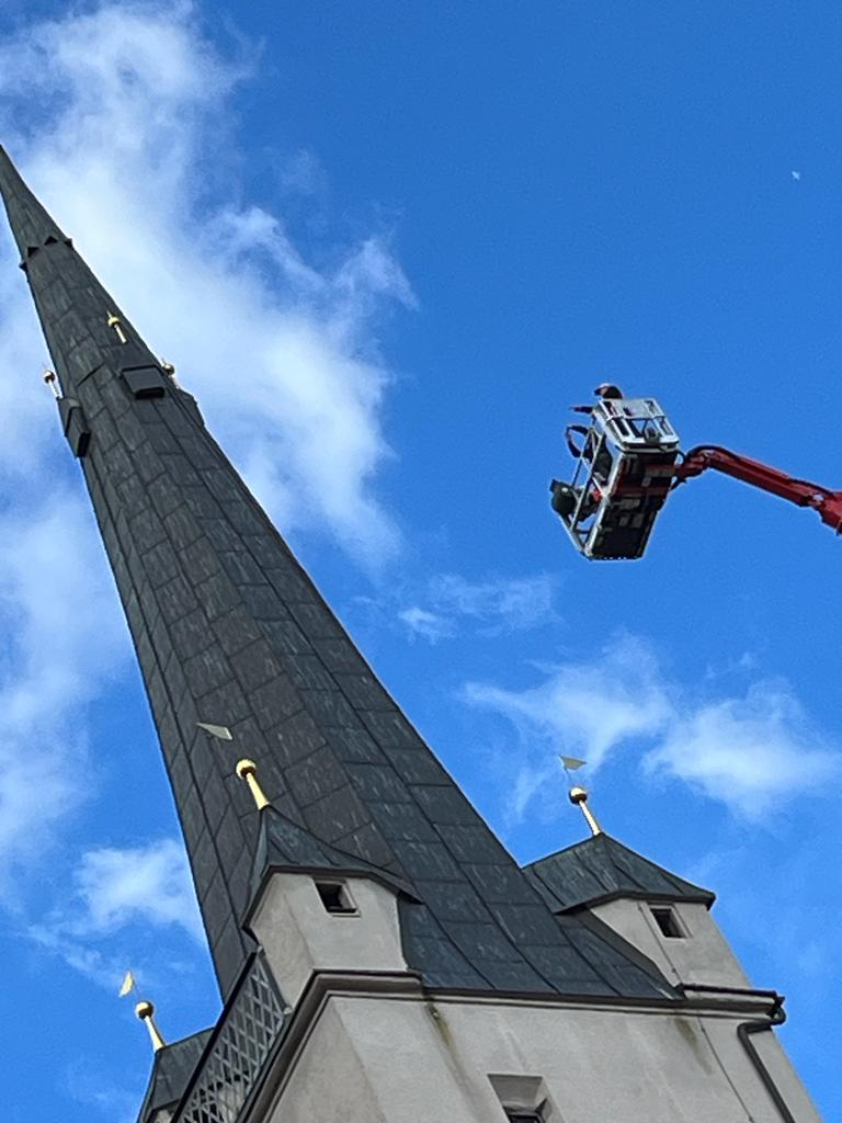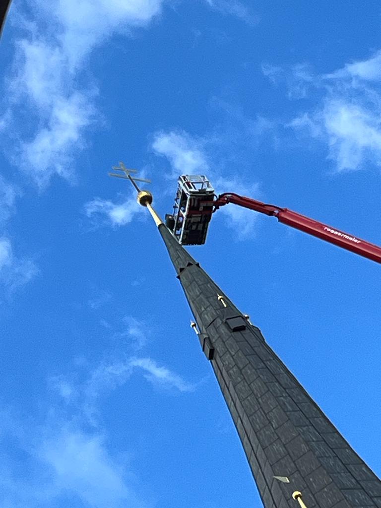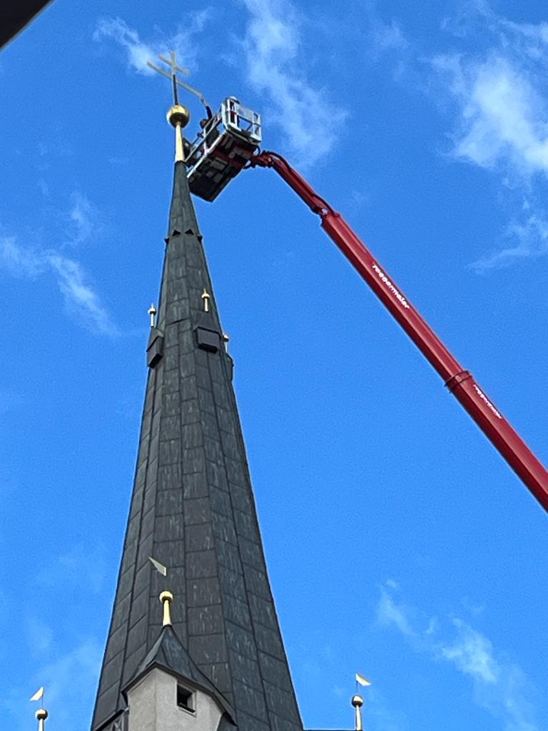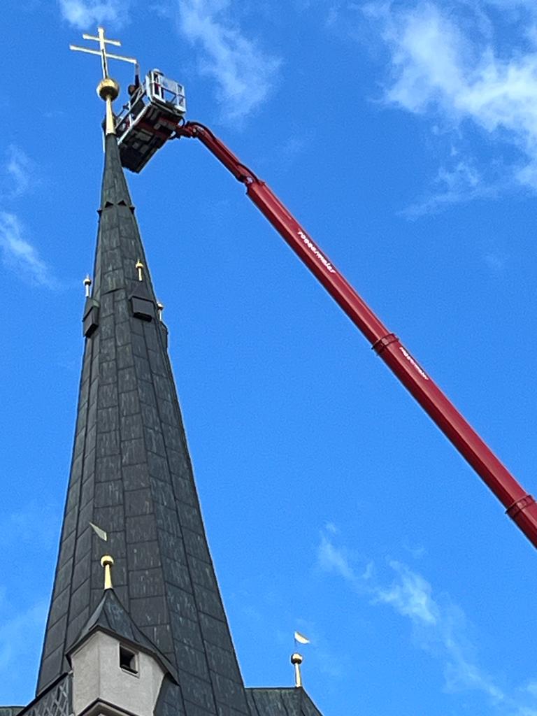 „UFO" mit neuem Standort - Kirchturmspitze mit Kran nach unten geholt