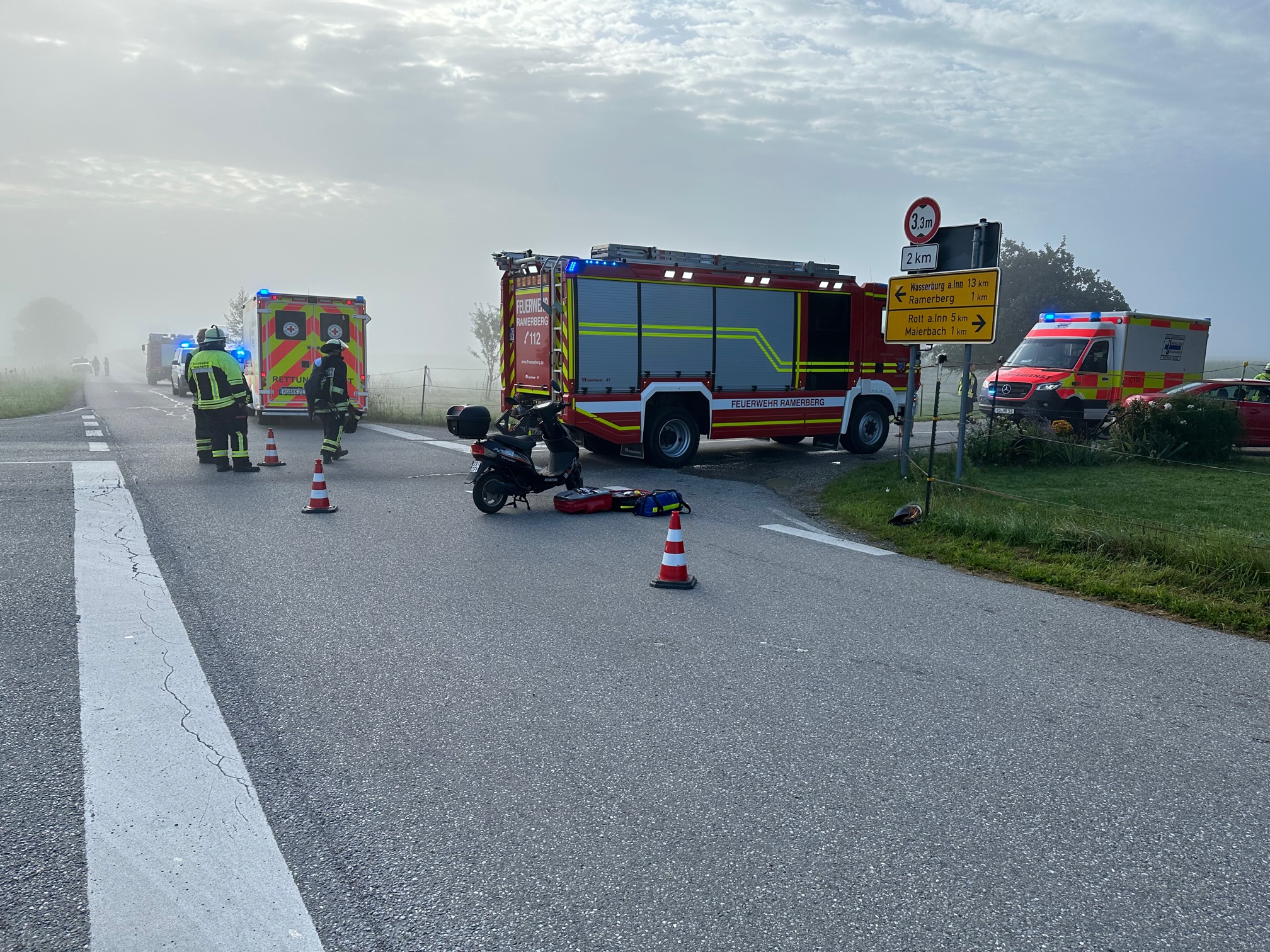 Mittwoch, 8.10 Uhr: Alarm für die Feuerwehr Ramerberg und den Rettungsdienst. Auf der Kreisstraße RO34 hat es bei Ramerberg einen Unfall gegeben. An der Kreuzung beim Weiler Mitterhof hat ersten Meldungen nach im Nebel ein Pkw-Fahrer einen Roller-Fahrer übersehen. Der Rollerfahrer mussten so scharf bremsen, dass er stürzte. Er und seine Beifahrerin wurden verletzt und kamen ins Krankenhaus. Fotos: Georg Barth