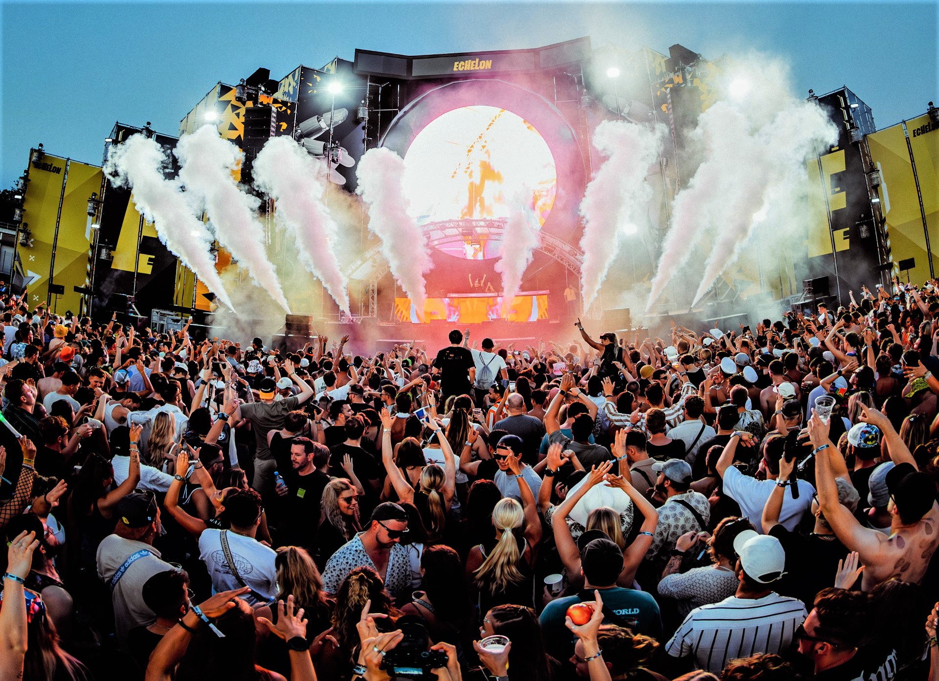 Zum Foto: Die Mainstage als neues Highlight auf dem Echelon … Flankiert wurde sie von zwei erhöhten Terrassen und gewährleistete so allen Besuchern beim Sundowner einen wundervollen Blick auf die Radome und die Berge.