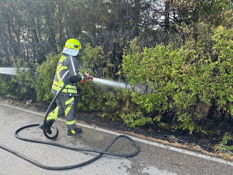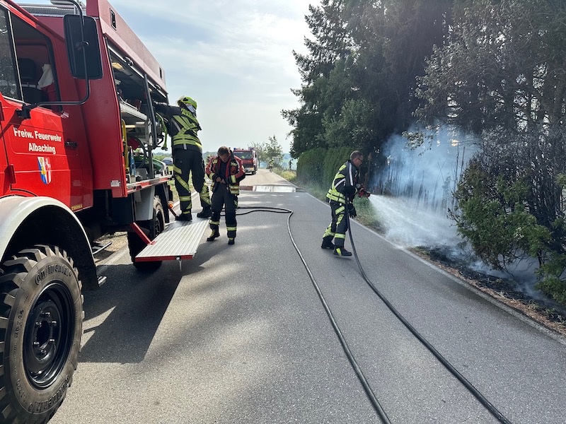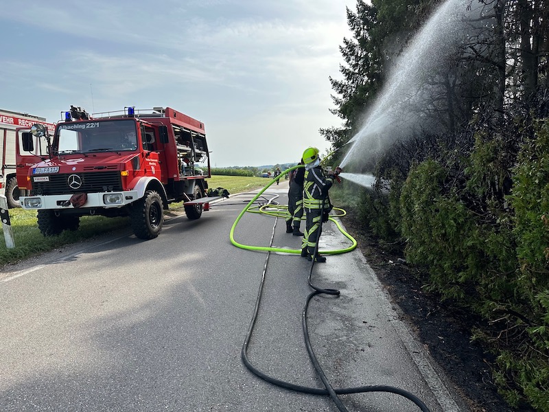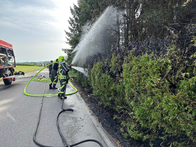 Alarm für die Feuerwehren Albaching, Haag, Maitenbeth und Rechtmehring: Am Donnerstagnachmittag rückten die Floriansjünger zum Weiler Lohe bei Albaching aus. Dort war eine Hecke in Brand geraten. Das Feuer drohte auf einen nahen Wald überzugreifen. Zum Glück waren die Feuerwehren rechtzeitig zur Stelle. Fotos: Georg Barth