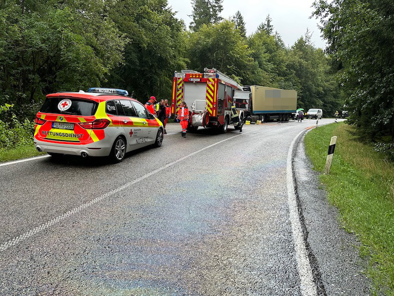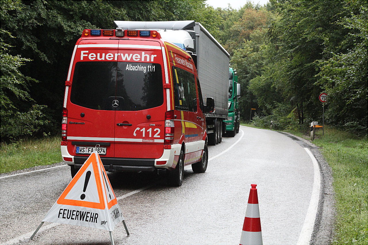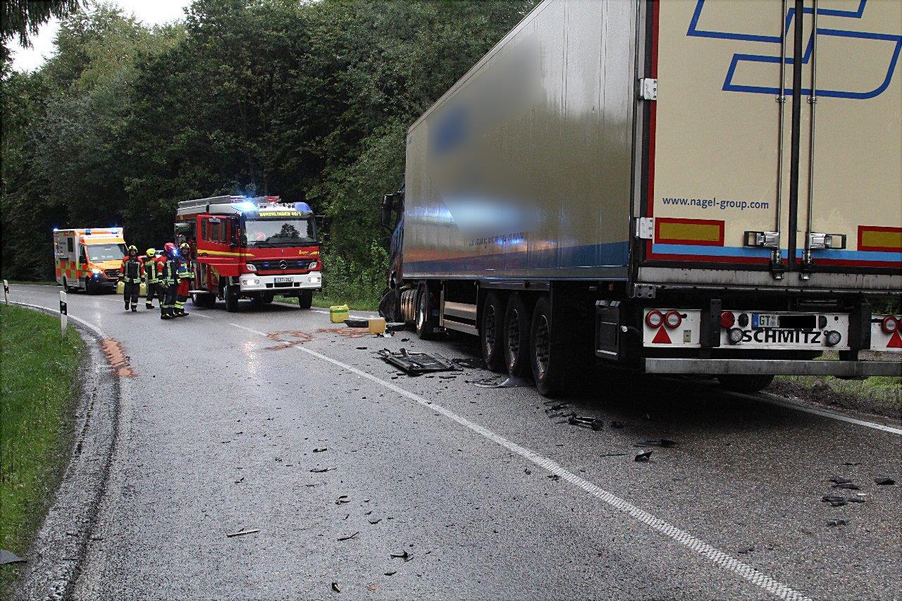 Einsatz für die Feuerwehren aus Albaching, Hohenlinden und Maitenbeth: Am Dienstagvormittag hat sich gegen 10.15 Uhr ein Unfall auf der Kreisstraße MÜ46 beim Weiler Schützen ereignet. Ein Pkw und ein Lkw sind zusammengeprallt. Es gab Verletzte. Polizeibericht folgt. Fotos: Georg Barth