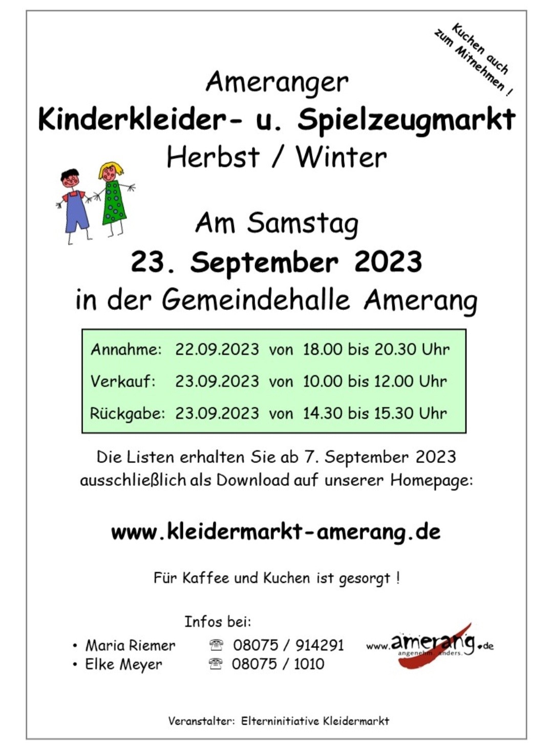 Verkauft werden:– Herbst- und Winterbekleidung ( Bis Größe 152 )– Umstandsmode– Schuhe– Spielzeug, Bücher– Wintersportartikel– Auto- und Fahrradsitze– Kinderwägen– Fahrzeuge … Infos unter: info@kleidermarkt-amerang.de