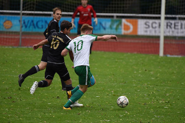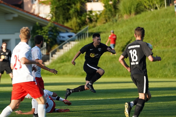 Youngster Tobias Lohmaier (Mitte) krönt seinen energischen Ballgewinn mit einem Assist zum 2:0 gegen Teisendorf (Foto oben: Semerad).