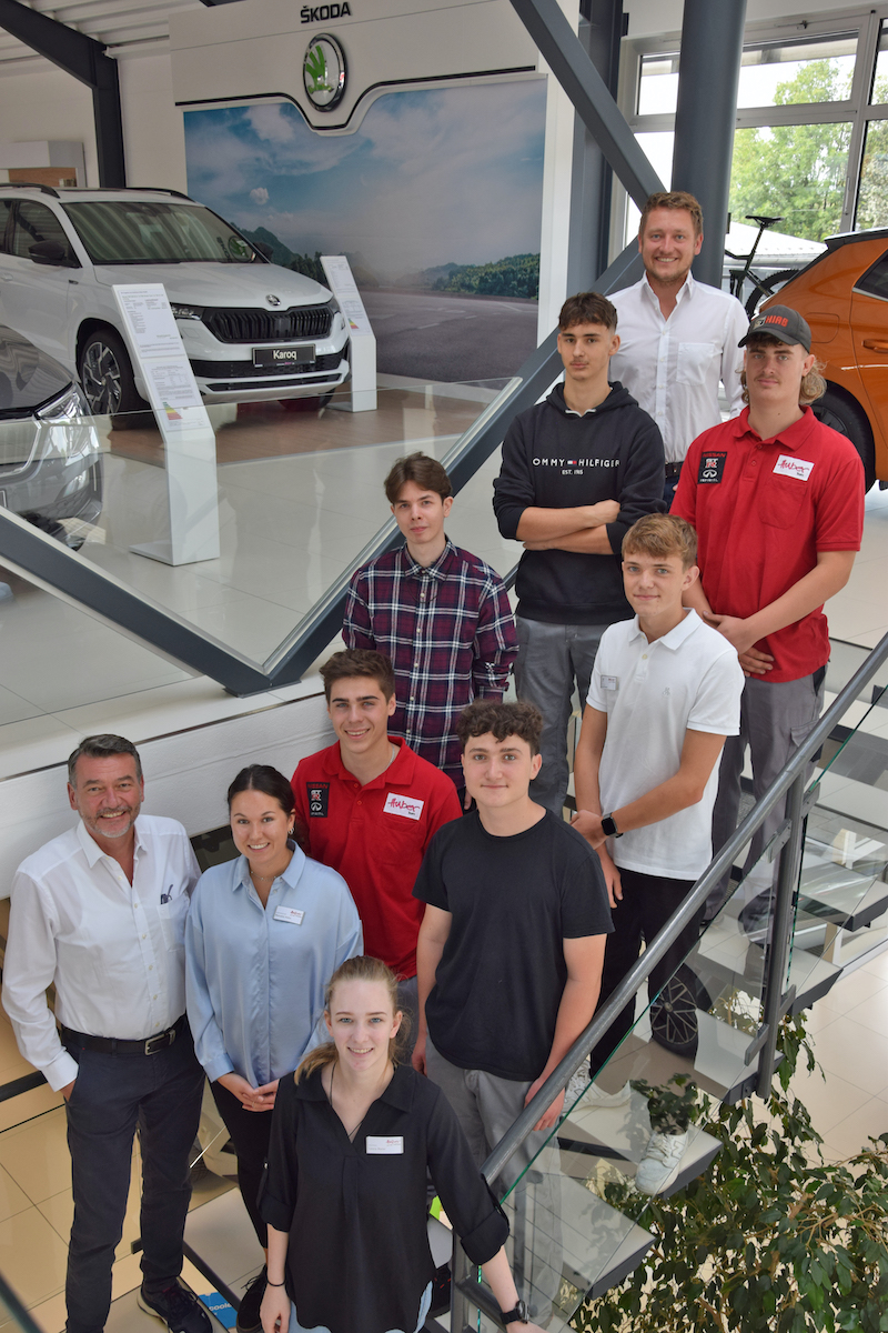 Foto (von oben links nach rechts): Thomas Linner (Geschäftsführer Skoda), Elias Neef (Kfz-Mechatroniker Skoda), Andreas Benkhauser (Kfz-Mechatroniker MKM), Mike Schober (Fachinformatiker für Anwendungsentwicklung MKM), Luca Pfauth (Automobilkaufmann Skoda), Julian Putz (Kfz-Mechatroniker MKM), Cyrill Schauer (Kfz-Mechatroniker Skoda), Martin Huber (Inhaber), Manuela Hahn (Ausbildungsbeauftragte), Laura Maier (Automobilkauffrau MKM).