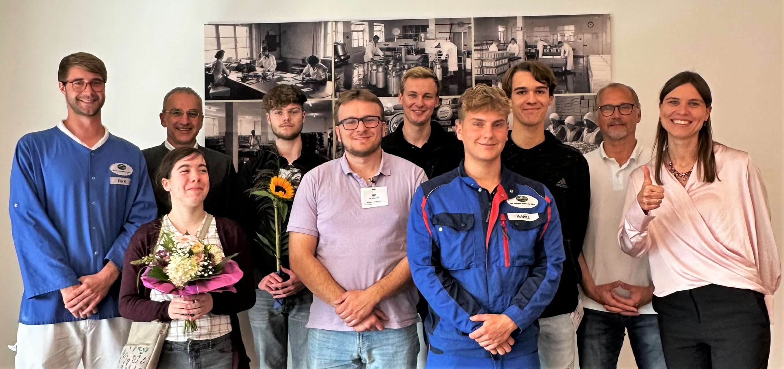 Das Foto zeigt von links Matthias Fink (Leiter Gesamtproduktion), Robert Winkelmann (Geschäftsführer), Sarah Bachschneider (Azubi Industriekauffrau), Jonas Sonnenberg (Azubi Industriekaufmann), Robert Grzeschik (Azubi Milchtechnologe), Philip Bacher (Ausbilder für Elektroniker), Julian Haider (Azubi Elektroniker für Betriebstechnik), Leon Kopp (Azubi Milchtechnologe), Hubertus Bauland (Geschäftsführer) und Julia Wagner (Ausbildungsleitung).
