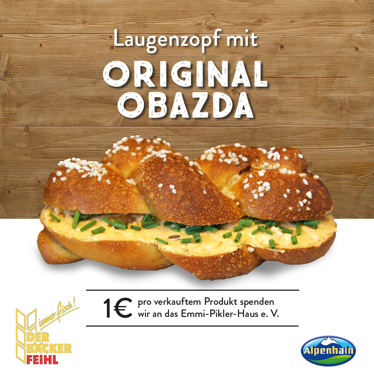 Im Rahmen der Charity-Aktion wird ab dem kommenden Montag, 25. September, in 26 Feihl-Filialen im Berliner Raum ein besonderer Laugenzopf mit dem bayrischen Brotzeitk-Klassiker angeboten: Das Gebäck ist mit Original Obazda bestrichen und je ein Euro des Verkaufspreises wird an das Emmi-Pikler-Haus e. V. gespendet.