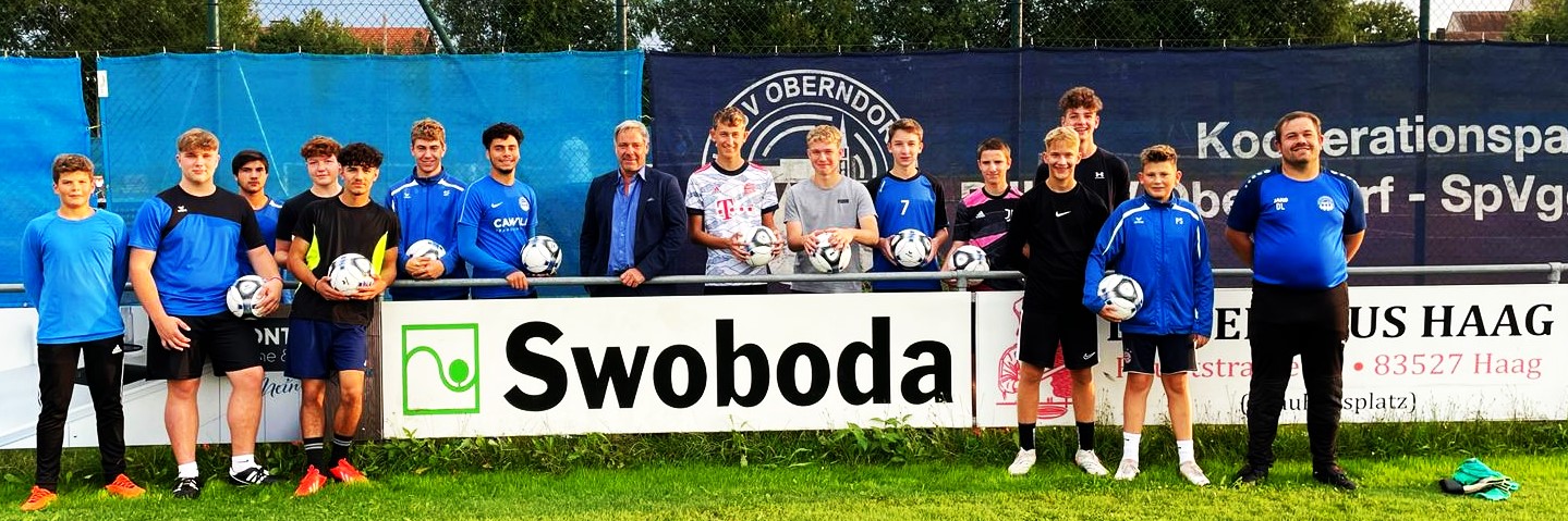 Wie schon im letzten Jahr zeigt der Schauspieler und Unternehmer Christian Swoboda aus Kirchdorf bei Haag auch heuer wieder ein großes Herz für den Nachwuchs-Sport: Für die Fußball-A-Jugend des DJK-SV Oberndorf um die Trainer Florian Zott, Tim Frische und Ernst Greger gab’s von ihm neue Bälle geschenkt.