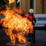 Die Jugendlichen lernten hierbei die Zusammenarbeit zwischen Feuerwehr und Rettungsdienst bei einer Patientenrettung mit der Drehleiter kennen und wurden im weiteren Verlauf auf den richtigen Umgang mit Feuerlöschern bei einem Brandsimulator geschult.