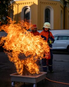 Die Jugendlichen lernten hierbei die Zusammenarbeit zwischen Feuerwehr und Rettungsdienst bei einer Patientenrettung mit der Drehleiter kennen und wurden im weiteren Verlauf auf den richtigen Umgang mit Feuerlöschern bei einem Brandsimulator geschult.