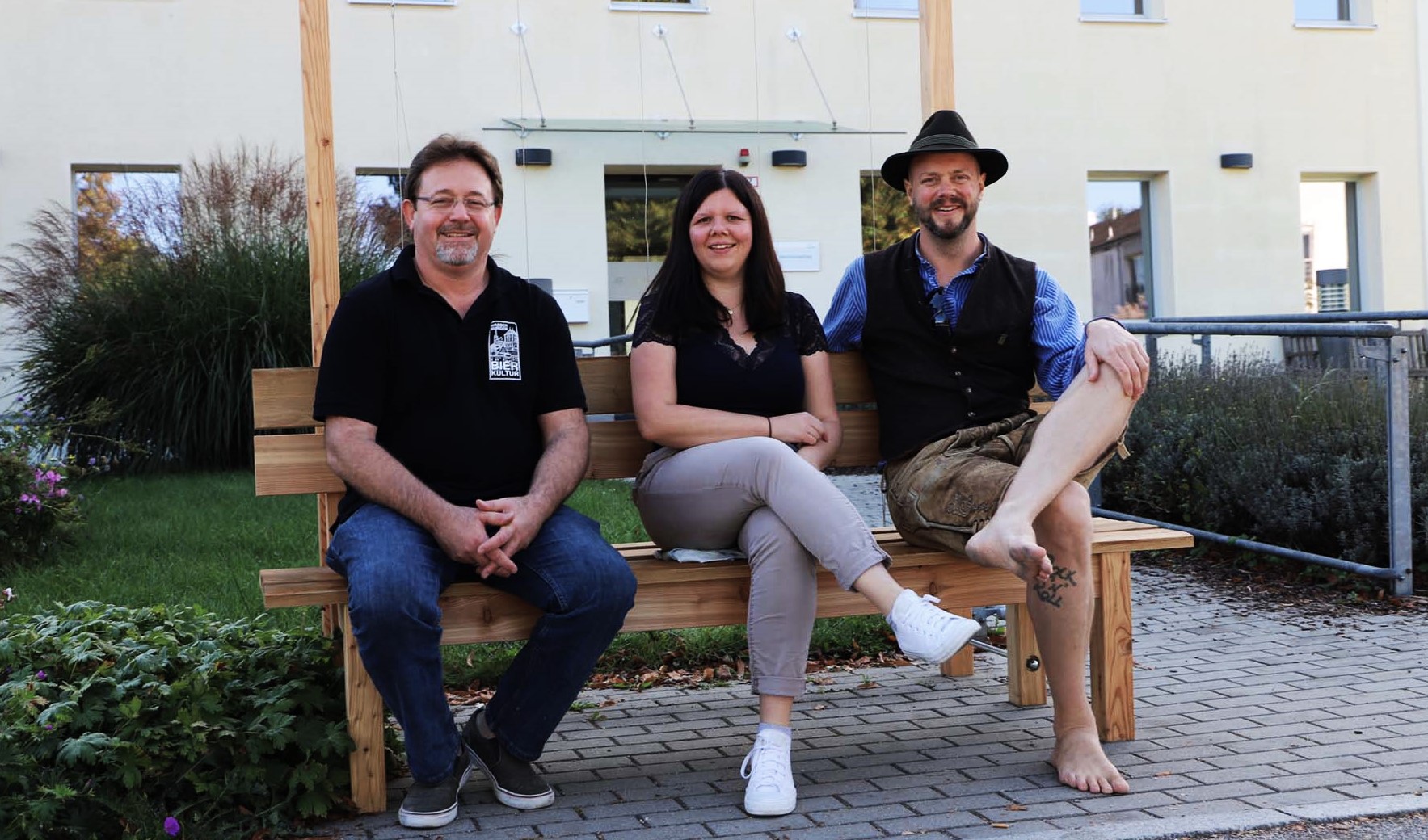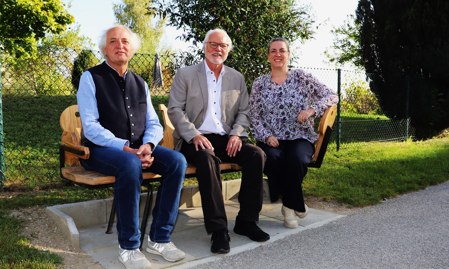 Foto unten: Es war dann soweit – Probesitzen auf der Schlüsselbank am Attler Rundweg mit (von links) Vorstand Jonas Glonnegger, Wasserburgs Zweiter Bürgermeister Werner Gartner und Vorständin Manuela Keml.