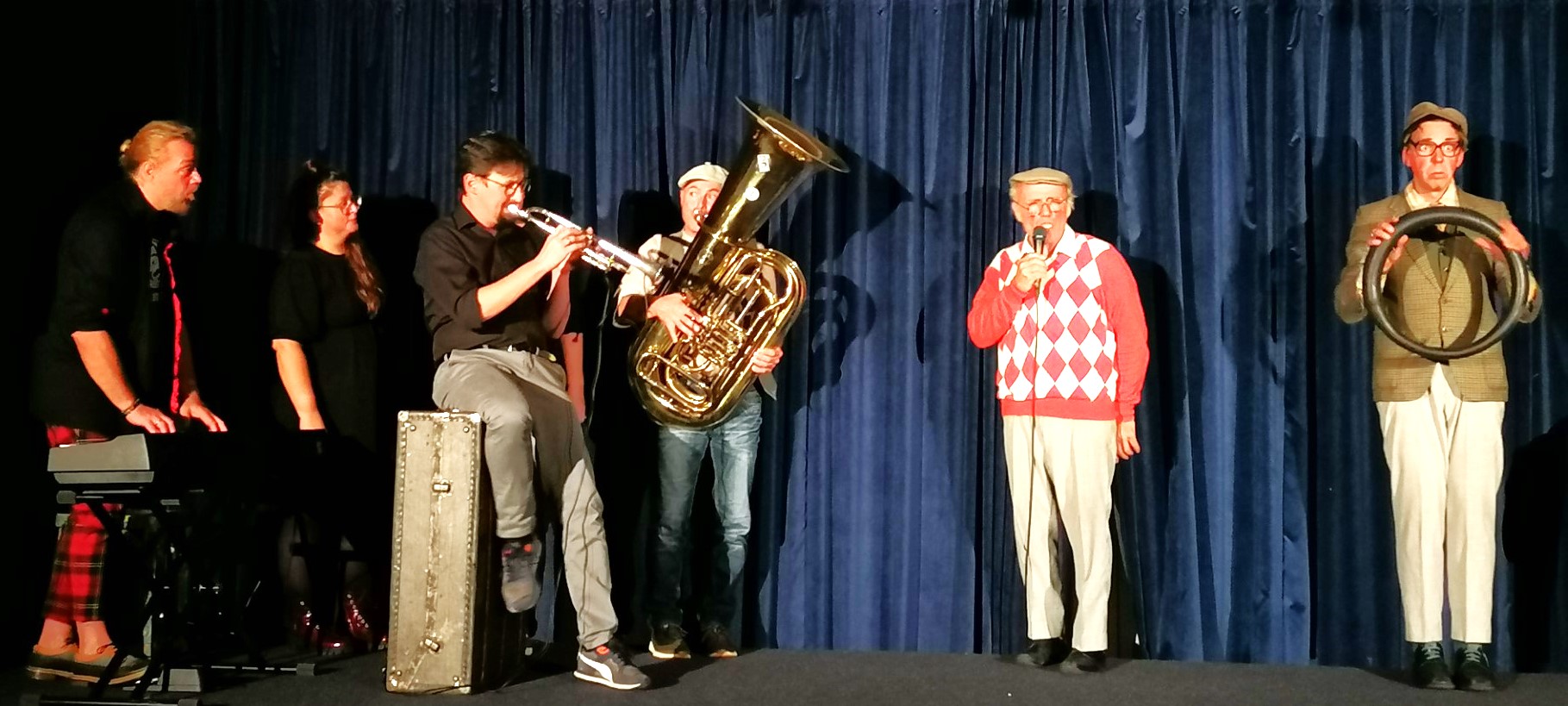 Musik trifft Clownerie: Im Gasthof Höhensteiger in Westerndorf – St. Peter bei Rosenheim begeisterten „Kupfadache“ und „RigoL und tOrF“. Das Foto zeigt sie gemeinsam auf der Bühne beim großen Finale …