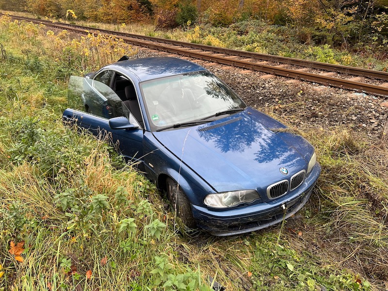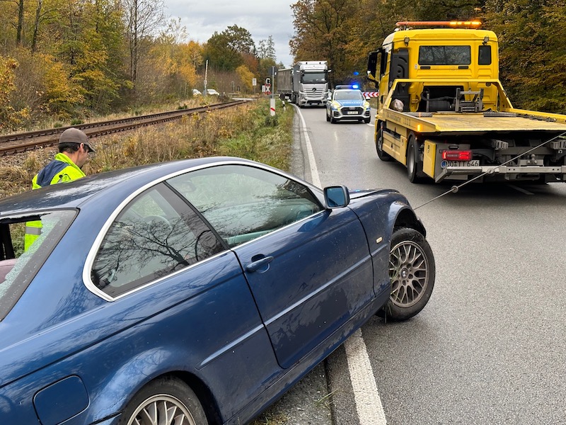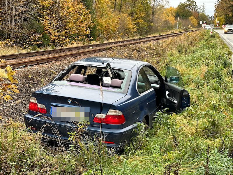 Zu einem Unfall an der B304 bei Forsting wurden heute Mittag Polizei und ADAC-Abschleppdienst gerufen. Der Fahrer eines BMW hatte offenbar die Kontrolle über sein Fahrzeug verloren und war mit dem Pkw von der Fahrbahn abgekommen. Das Unfallfahrzeug stand danach mit dem Heck auf der Bahnstrecke, die neben der Bundesstraße verläuft. Dort wurde es von Ersthelfern herunter befördert. Der Unfallwagen musste abgeschleppt werden. Fotos: Georg Barth