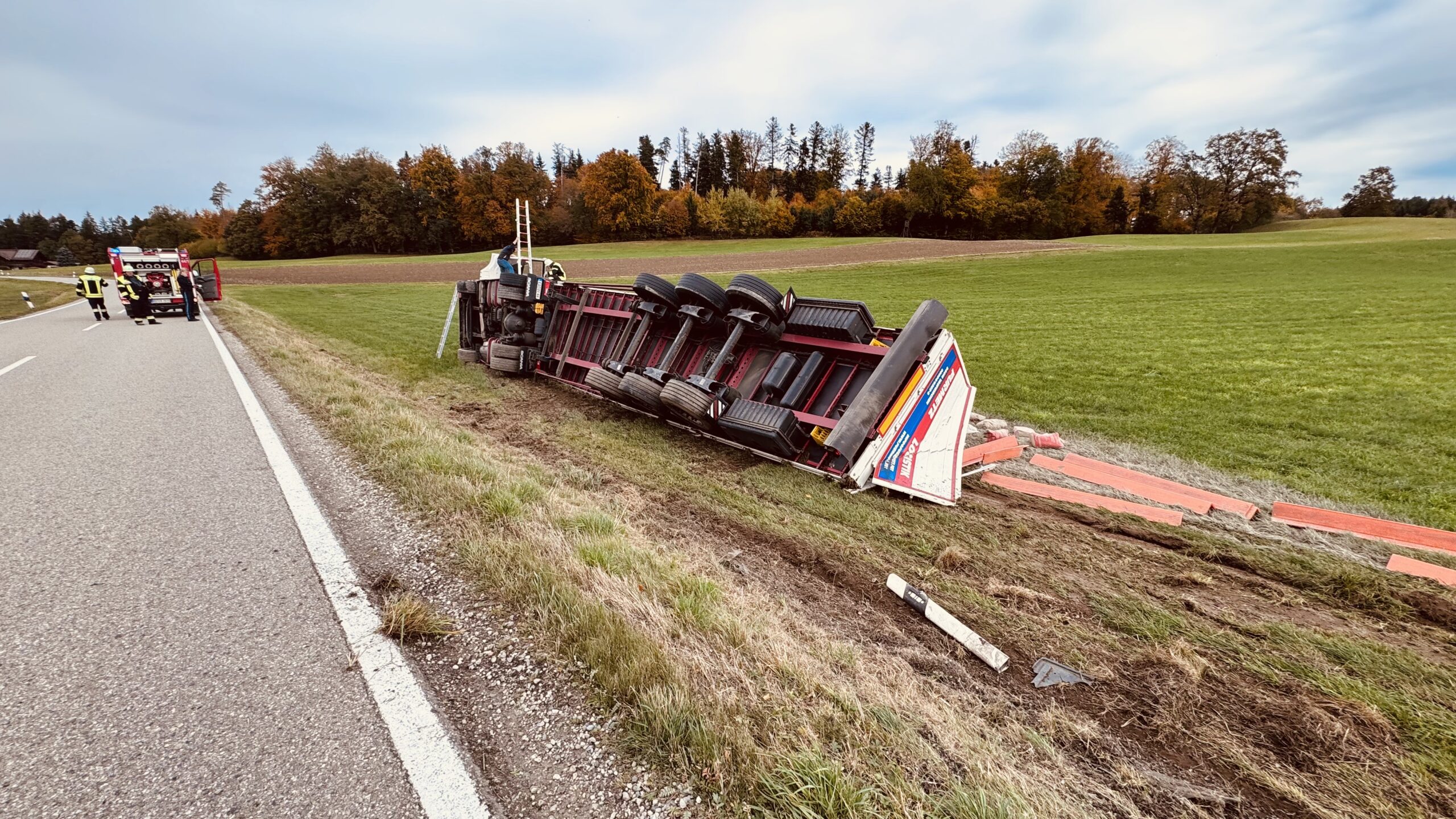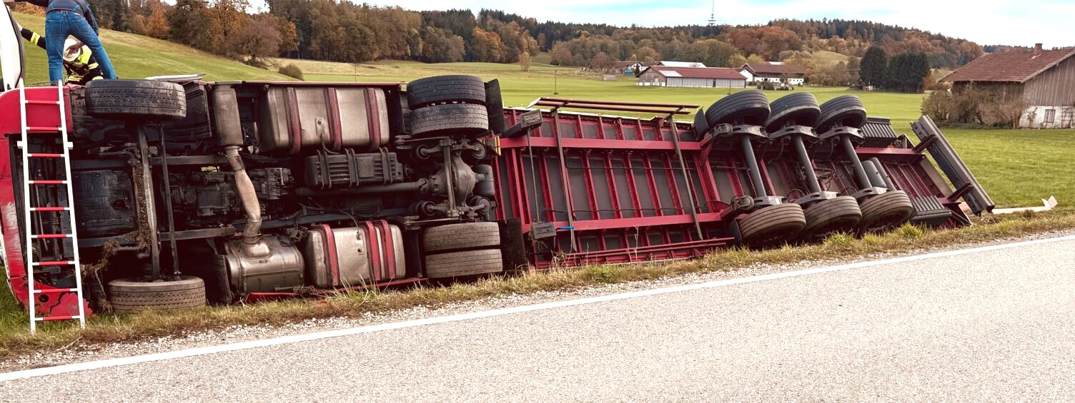 Gegen Mittag ereignete sich heute ein Verkehrsunfall auf der Kreisstraße RO 39 bei Kirchloibersdorf im Gemeindegebiet Babensham. Ein 18-jähriger Führer eines Sattelzuges aus Dorfen befuhr die Kreisstraße von Kirchloibersdorf kommend in Richtung Unterreit. Im Bereich einer leichten Linkskurve kam der Sattelzug aufgrund Unachtsamkeit des Sattelzugführers nach rechts von der Fahrbahn ab. Die Sattelzugmaschine fiel mitsamt dem schwer beladenen Auflieger in die abschüssig gelegene Wiese und blieb auf der rechten Seite liegen. Der Führer des Sattelzuges wurde bei dem Verkehrsunfall glücklicherweise nur leicht verletzt und wurde zur weiteren Abklärung in ein nahegelegenes Krankenhaus verbracht. Es entstand insgesamt ein Sachschaden von zirka 80.000 Euro. Aufgrund der aufwendigen Bergung kam es zu mehrstündigen Beeinträchtigungen des Verkehrs. Neben dem Rettungsdienst befand sich die Feuerwehren Kling, Titlmoos und Schnaitsee mit etwa 25 Kräften vor Ort.