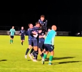 So dauerte es bis zur 80. Minute, bis der Bann aus Sicht der Gäste gebrochen schien: Nach einer geklärten Heimann-Ecke kam der Ball über Umwege zu Dominik Lindlmeier. Dieser zog aus 20 Metern einfach mal ab und der Ball senkte sich abgefälscht über Heim-Keeper Manstetter hinweg ins lange Eck zur Oberndorfer Führung. Das Foto zeigt die Freude darüber …