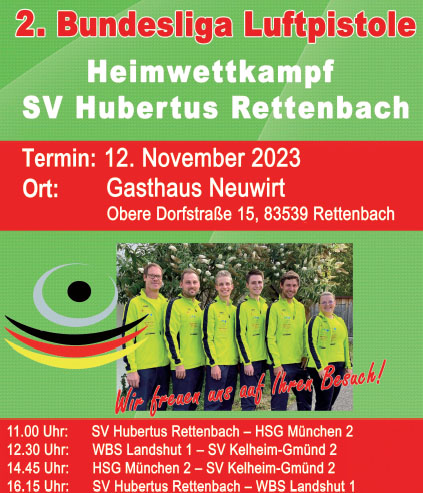 Die 1. Mannschaft des SV Hubertus Rettenbach fiebert in der 2. Bundesliga Süd Luftpistole dem kommenden Sonntag, 12. November, entgegen. Da steigt ein absolutes Highlight: Der Heim-Wettkampftag im eigens dafür hergerichteten Neuwirt-Saal. Der aktuell Drittplatzierte der zweithöchsten Liga Deutschlands (wir berichteten) freut sich auf die Gäste aus München, Landshut und Kelheim-Gmünd, derzeit Zweitplatzierter.