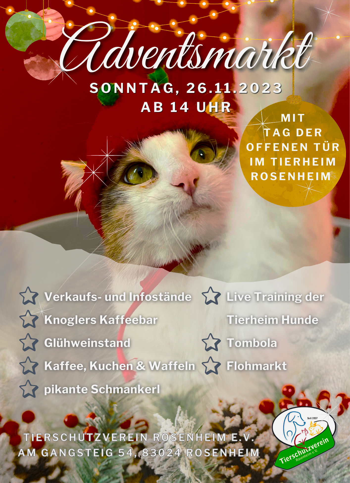 Adventsmarkt mit Tag der offenen Tür: Am Sonntag, 26. November, öffnet das Rosenheimer Tierheim am Gangsteig 54 von 14 bis 17 Uhr wieder seine Türen und lädt alle Tierfreunde zu einem Adventsmarkt ein. Hier warten nicht nur 136 Katzen, 34 Hunde und viele Kleintiere und Reptilien auf die Besucher, sondern es wartet auch ein buntes Rahmenprogramm.